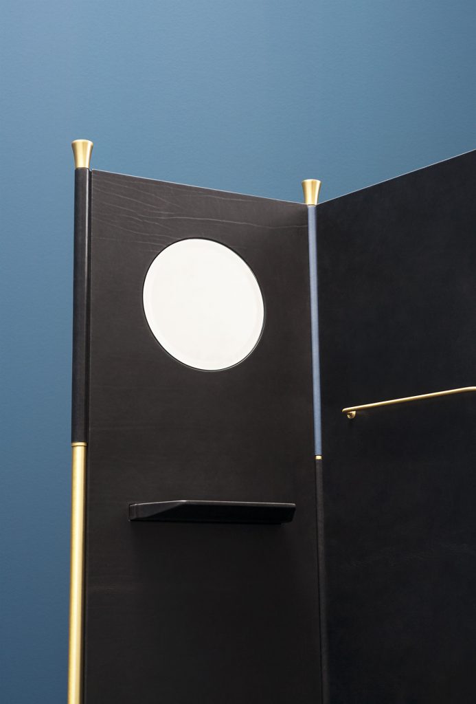 Screen/ Room divider with six multicolor, leather panels. Comes with a mirror, brass accessories, and furnishings. This product is discontinued.
