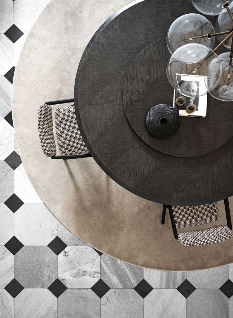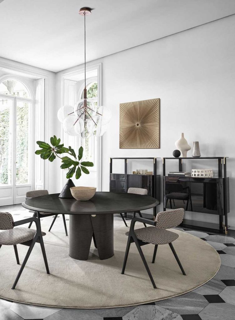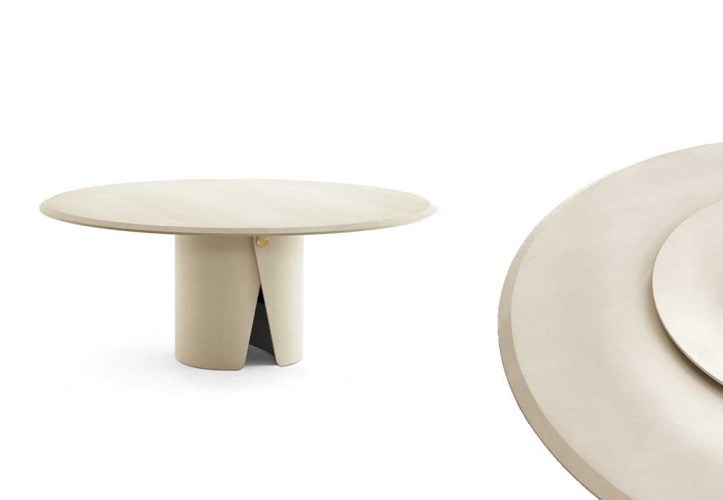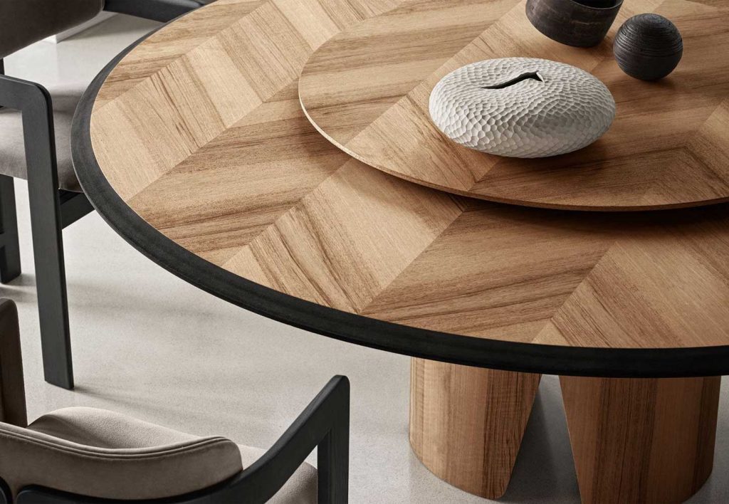 Table with top in "Colore" Frisè Walnut herringbone wood inlay and black bevelle dedge. Also available in "Colore" Frisè Walnut, grey Frisé Maple or white Frisè Tanganika with bevelled edgein the same finish. Curved base with satin brass button. Lazysusan on request, Top resting, available in the same finishes as the table top.