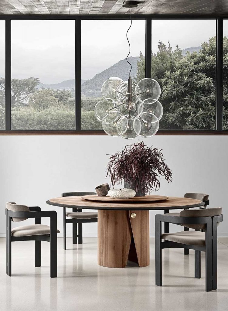 round dining table made of brass and ash wood base in a black tone on a white background