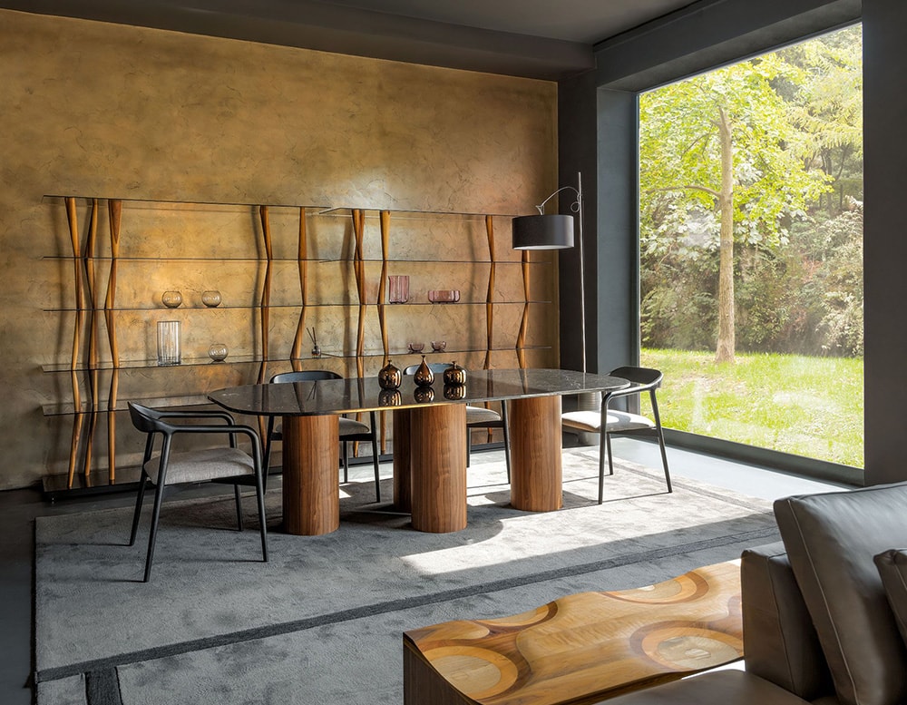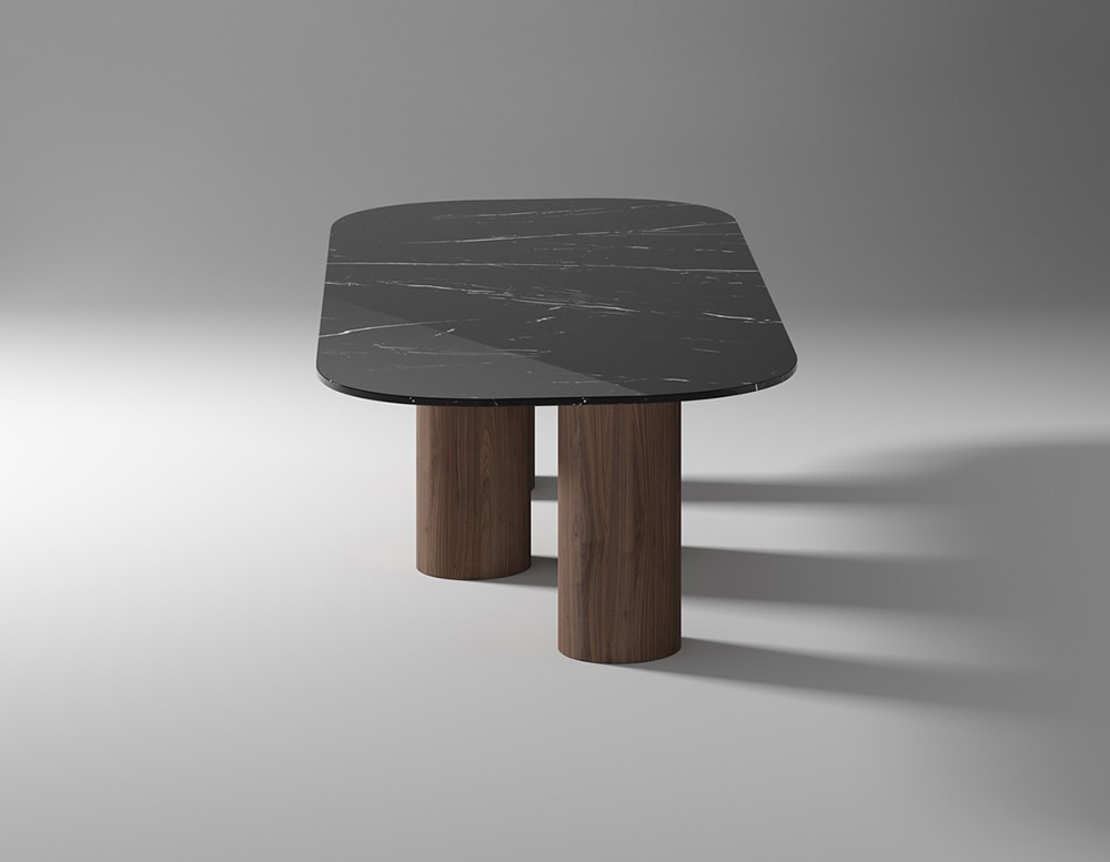 Marina is a family of tables and side tables, designed by Renato Zamberlan their essence lies in the harmonious disproportion between the cylindrical canaletto walnut legs and the unyielding marble top. The shaping draws on the Marine works of Venetian painter Virgilio Guidi, an artist capable of evoking a lagoon landscape with a few, apparently simple features, the result of a synthesis bordering on abstraction. The Marina collection summarizes the traditional lines of the table in a few strokes, eliminating any superfluousness. It skilfully employs wood and marble to obtain powerful, evocative shapes.