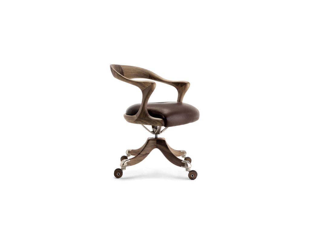 Swivel armchair made in solid American walnut, upholstered plywood seat, 4 star base with brass feet and swivel wooden castors.