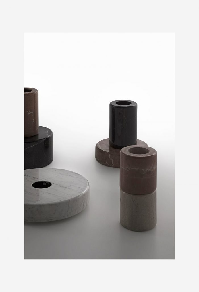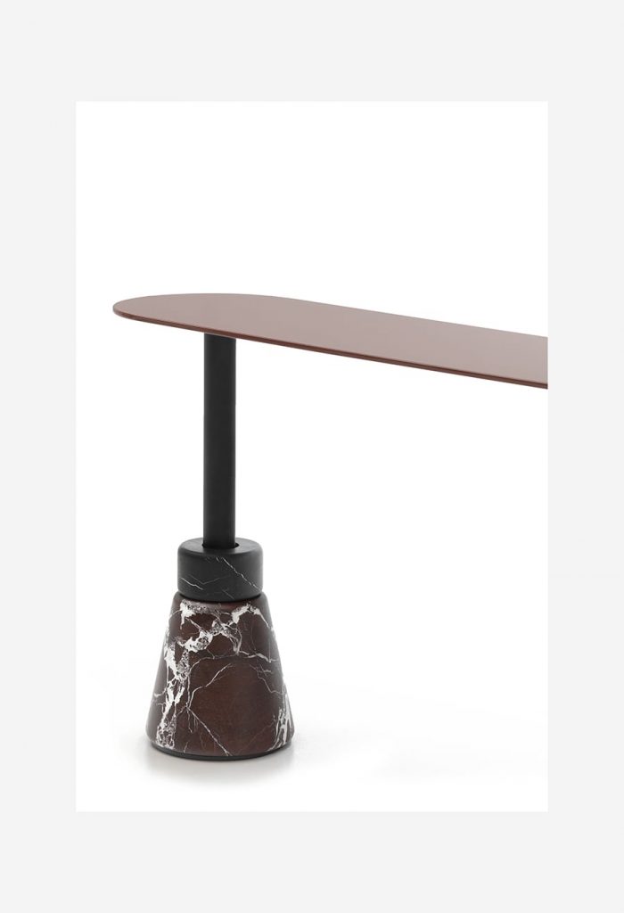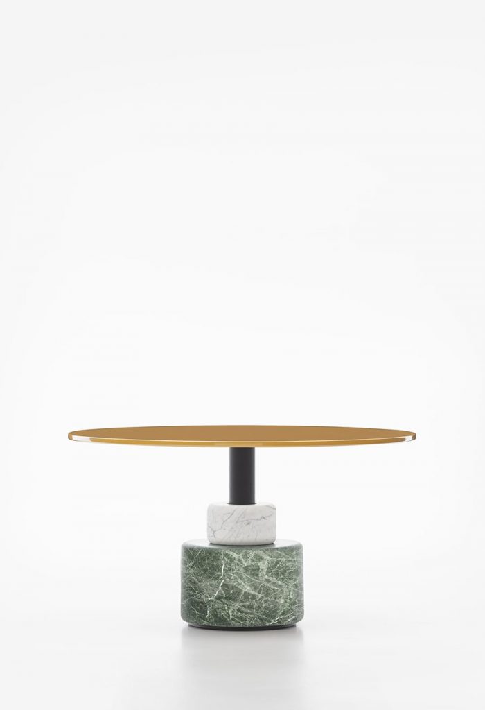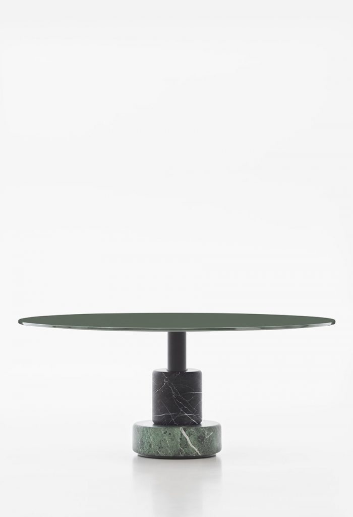 With a daring approach to materials, the Menhir low table becomes a composition of colors and textures that eloquently illustrate the sculptural simplicity of Lodovico Acerbis and Giotto Stoppinòs inventions of new forms. With a Greek-like classicism, the tablès column connects the monumental marble base, matte in its contemporary version, to a tabletop newly rendered in lacquered wood or black ash wood and natural walnut, creating a striking exchange between colors and elements. Newly conceived in three different heights, the Menhir low table vaunts a more dramatically-sized round top, and now appears as a tall console as well, a concept from the original designs today in production for the first time. Tops in the Ø 80, 100, 120 cm size and 180x40 for consolles.