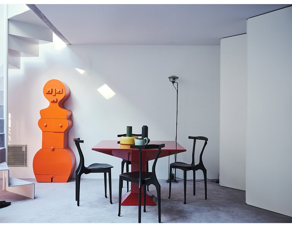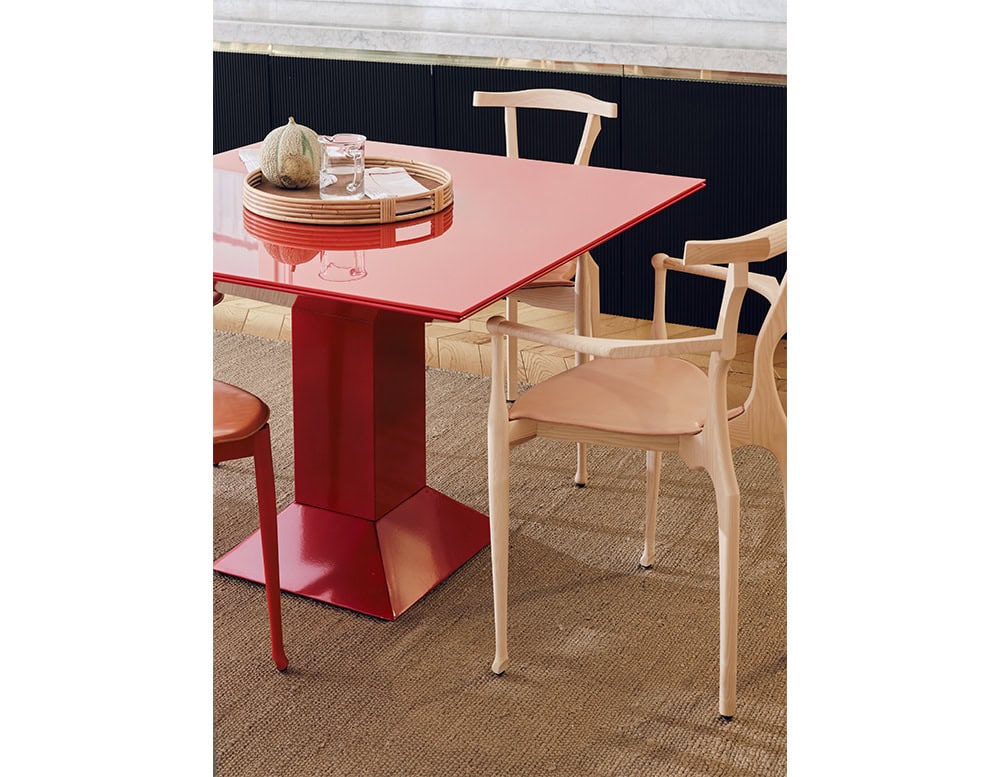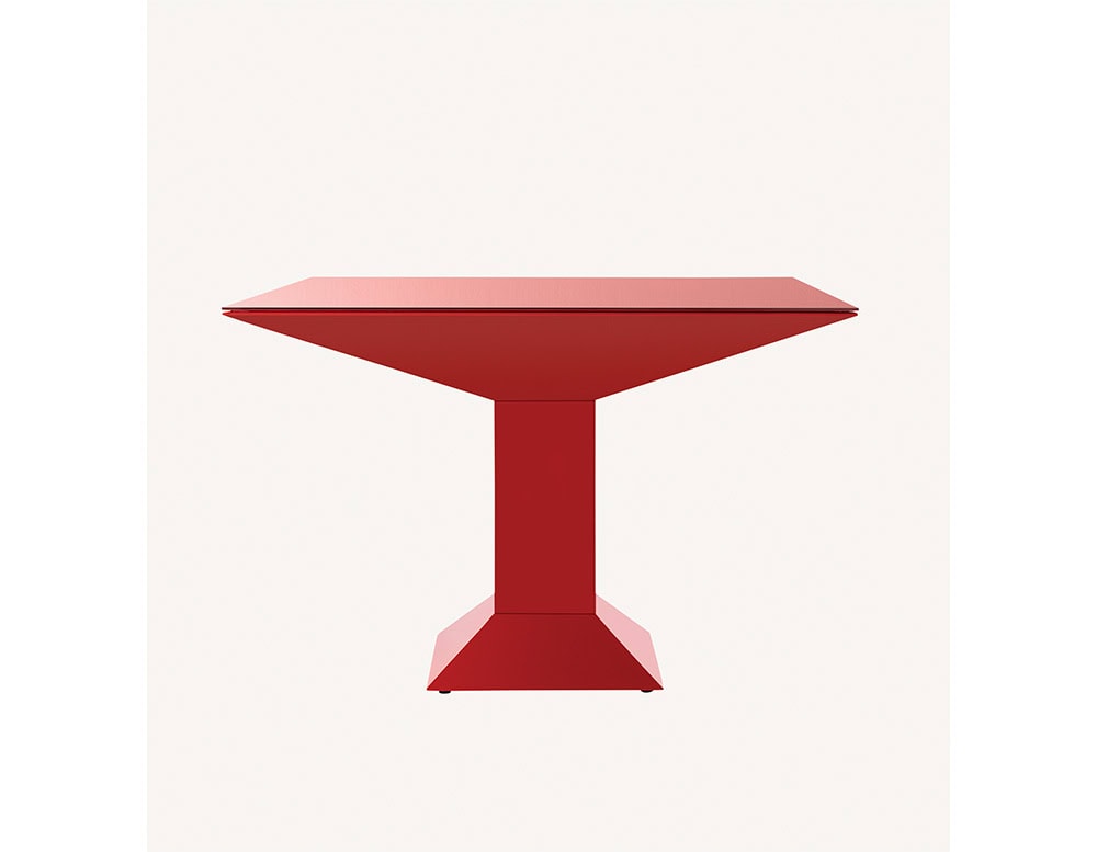 The Mettsass is a big, red moment in a room. Ettore Sottsass designed the table with a confident shape and bright colour. It is bold and powerful. It is constantly new. The Italian architect, industrial designer, innovator and artist Ettore Sottsass designed the Mettsass table for BD in 1972, nearly a decade before co-founding the Memphis movement, which shifted modern design forever. He was always one to experiment, and his preoccupation with nonconformity defined the architecture of the Mettsass with flat sheets of steel, a vibrant coat of red, and a cultivation of aesthetics and emotion. The colour and geometry are bold and conspicuous, far from the Bauhaus minimalism of the era. Reissued in 2012 and still in production today, the Mettsass remains functional but has a sensory dimension that is traditionally inaccessible. It works as a table and sits like a giant gem.