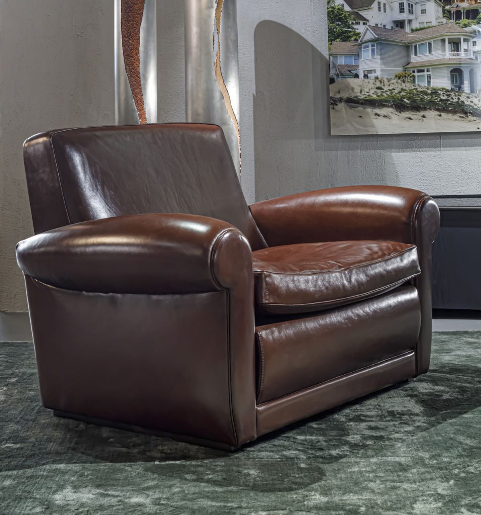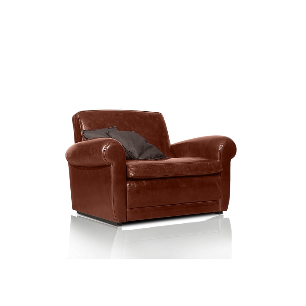 Armchair upholstered in a maroon colored leather - Tuscany: ribolla. With decorative piping in the same shade. The armchair sits on walnut stained beach feet. DISCONTINUED