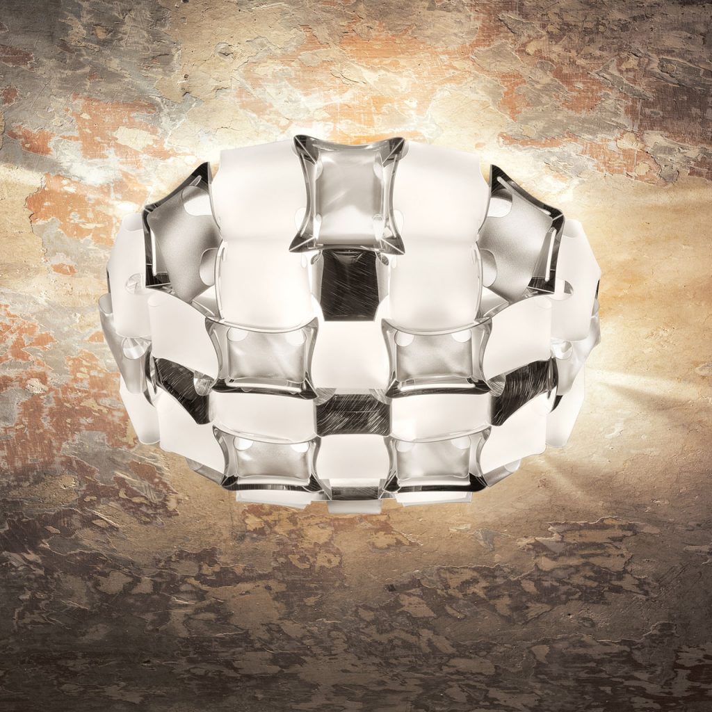 cabochon are geometrically scattered across a floral corolla with silky, iridescent stones. Available in five color combinations, from the flashy Multicolor, to the more versatile White/Platinum and White/Gold. Mida is fully handcrafted of white Opalflex® and printed Lentiflex®, whose silky morphing effect alternates with the brushed metallized gems. Mida makes any room extra-luxurious.