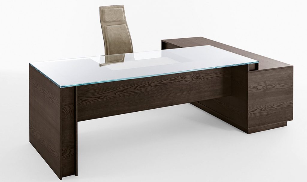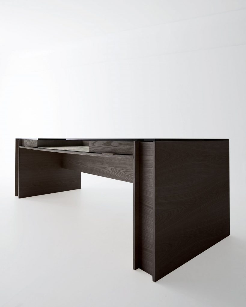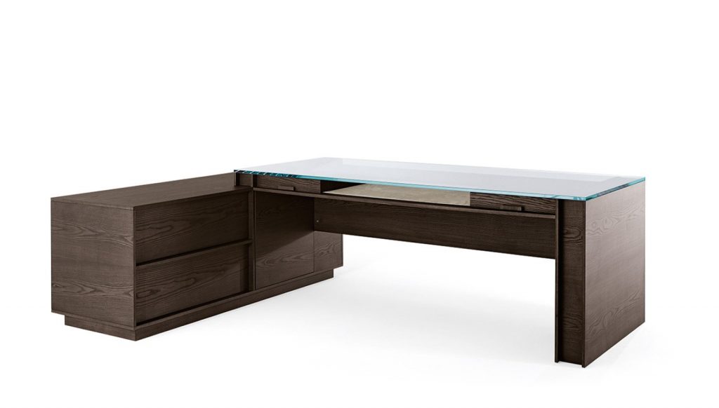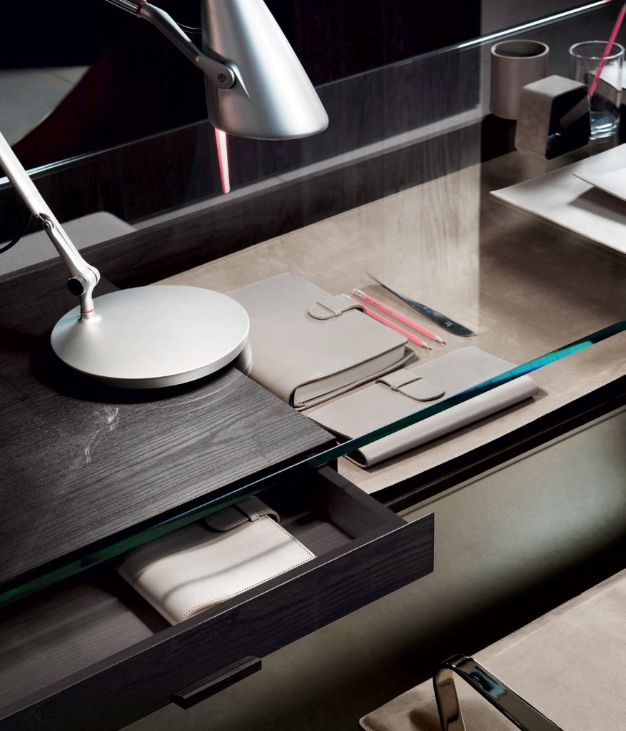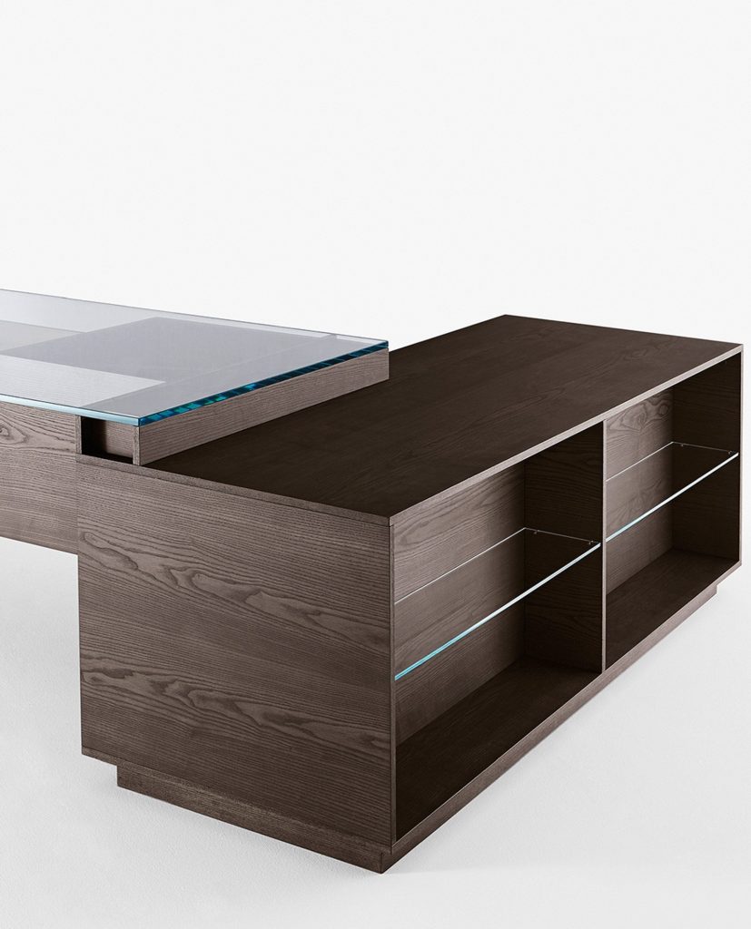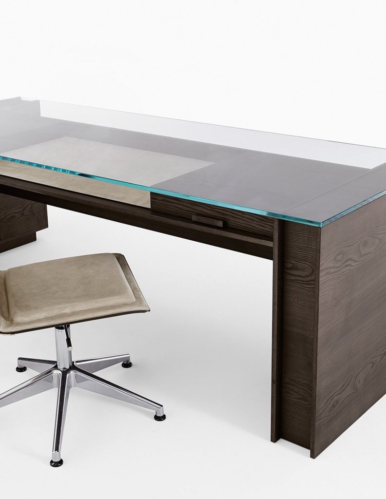 Milano - Executive desk with structure and drawers in natural ash, tobacco stained or black lacquered open pore (mod. Layer). 15 mm transparent glass top. Available also 12 mm smoked "grigio Italia" glass top. Suede or leather writing pad as per samples. Milano 1 - Executive desk with one side resting on Milano unit with doors and drawers (front) and open (back).