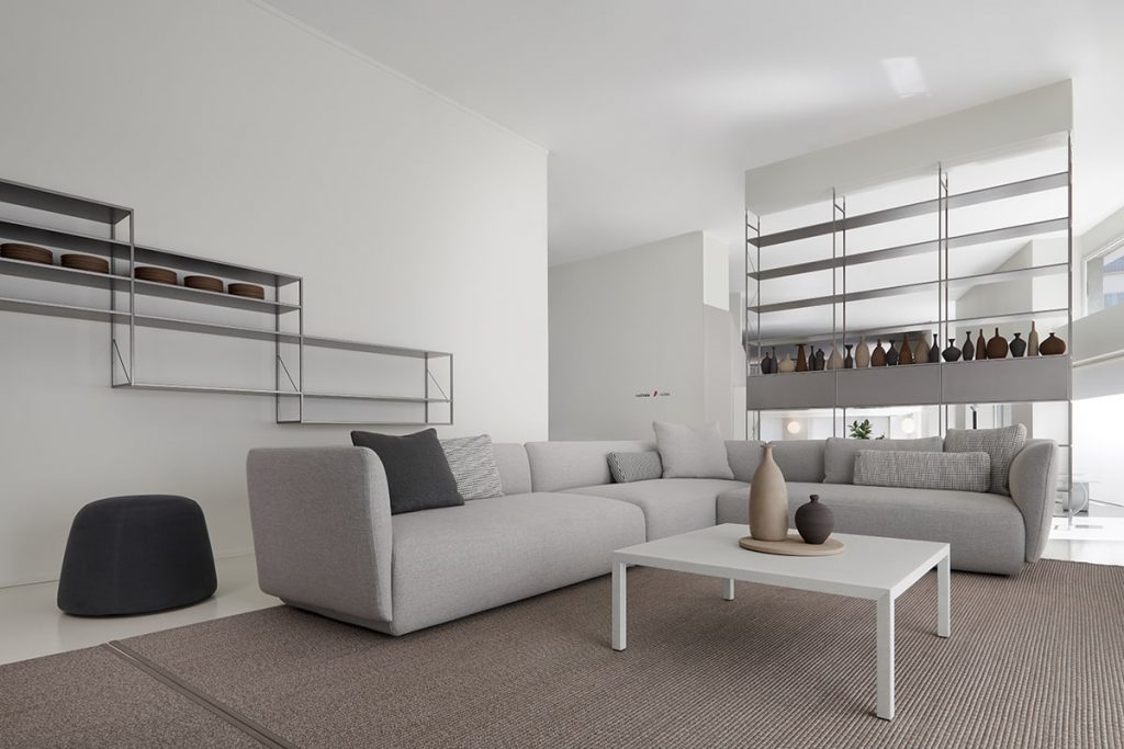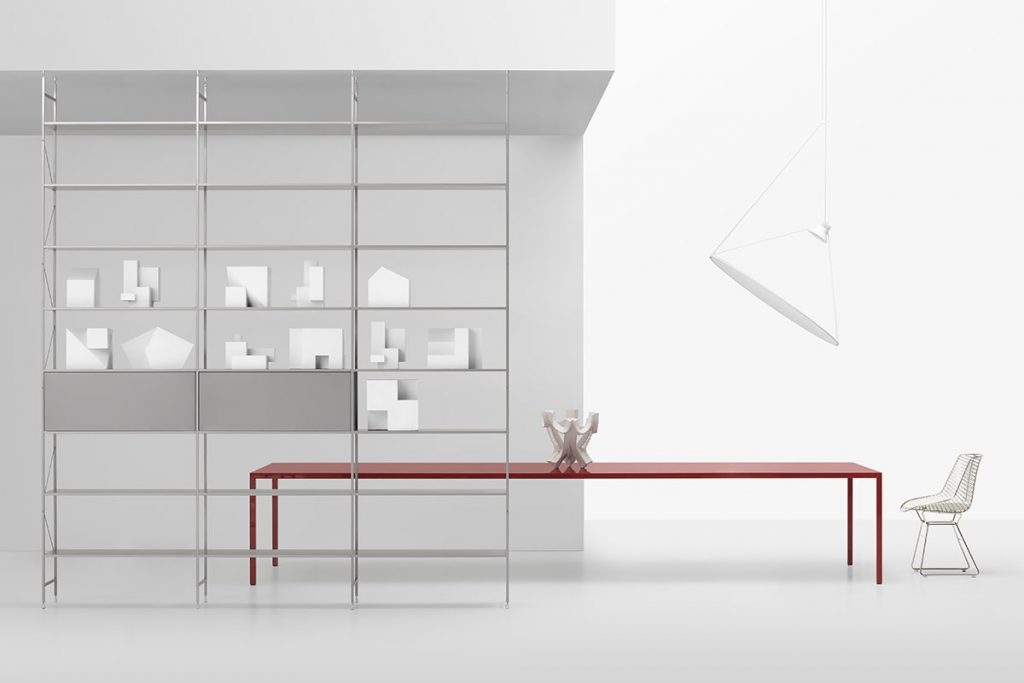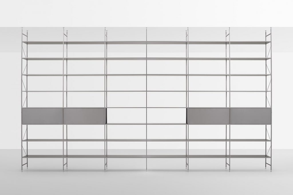 More than just a bookcase, Minima 3.0 Room Divider is a versatile system made of 100% recyclable aluminum in 4 different finishes - white, graphite gray, shadow grey and pearl nickel - suitable for different functions.