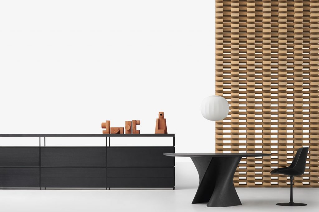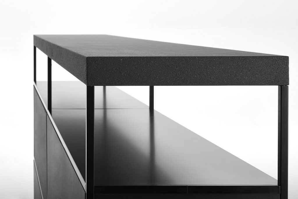 Available in 8 configurations with a height of 64 or 100 cm and in 4 colours - white, graphite gray, shadow grey and pearl nickel - it is equipped with a material top made of Italian walnut or reconstructed White Carrara and reconstructed Black Ebony marble and is equipped with containers or drawers.