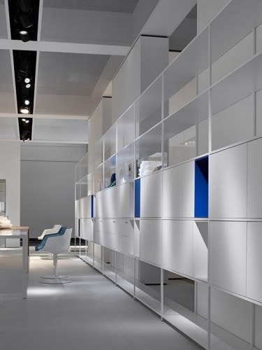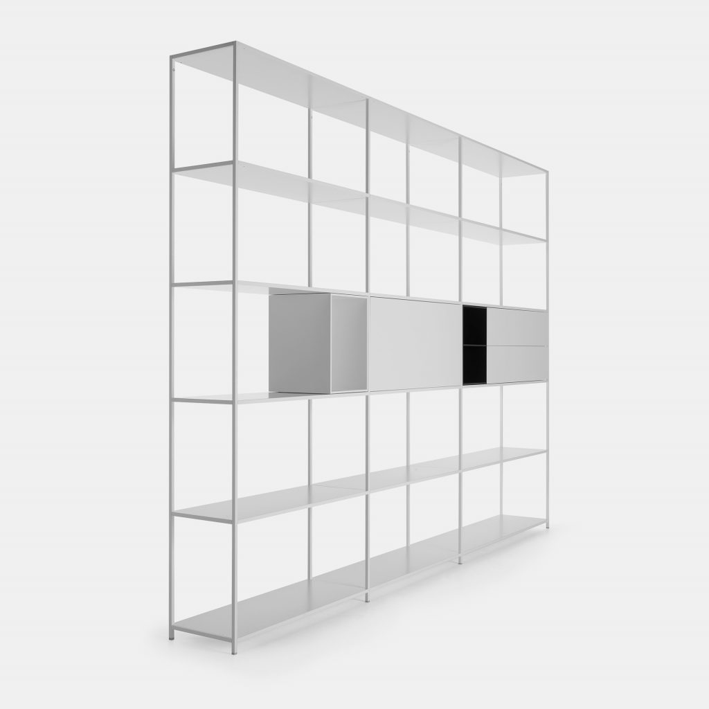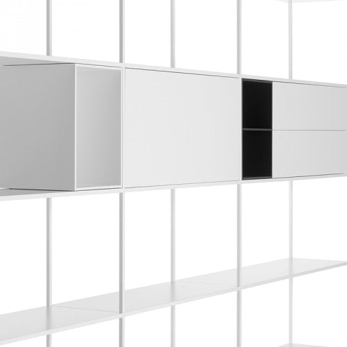 The considerable span of the shelf in extruded aluminium combined with the joining system, have allowed to develop the system in length, making it modern and adjustable to any kind of environment. Modular and flexible even thanks to the new kinds of storage units. This can be with open, door, flap opening doors or drawers. They are simply resting inside the structure and are repositionable quite easily, thus allowing to meet any storage requirements as desired. Uprights and shelves made of matt lacquered white and graphite grey extruded aluminium (100% recyclable). Nominal lengths of cabinets: 30, 60, 90 cm, height 42 cm and depth 33 cm. Available in a matt lacquered micro-goffered finish or in a wood variant. Minima 42 is available in a ground-resting variant (in 5 heights), always with a 33 cm depth.