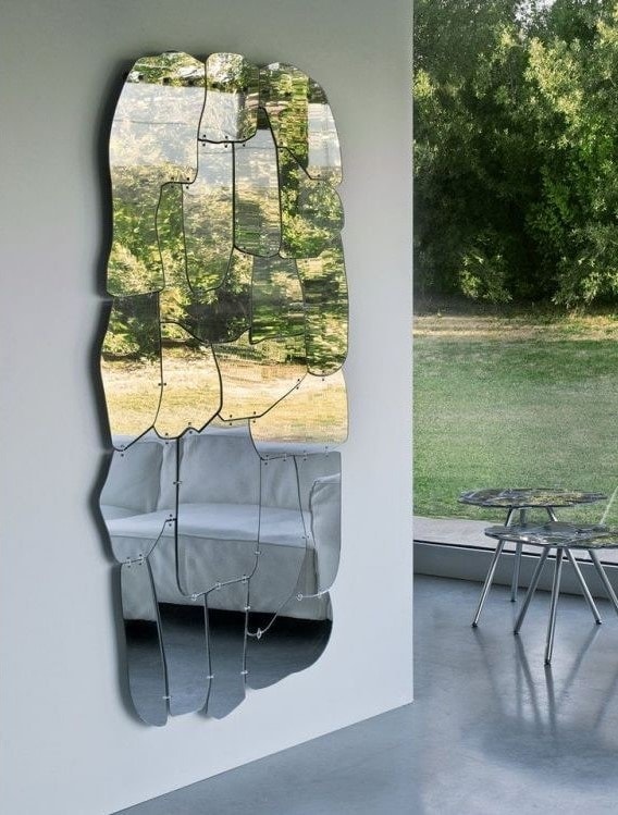 Wall mirror, formed by the manual assembly of cutouts of different shapes in colorful acrylic mirror, laser-cut, hand-finished on their edges and connected by nylon ties. The aluminum support keeps it away from the wall.