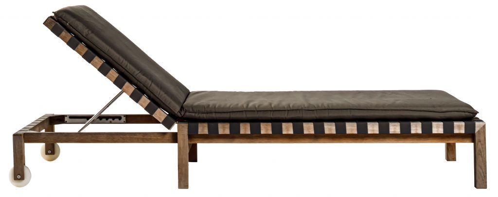 An outdoor chaise lounge with weather safe cushions in brown - dew. Chaise features fabric straps constructing the seat. Straps fixed directly to a solid teak wood structure with a natural aged finish. Back legs feature rolling castors.