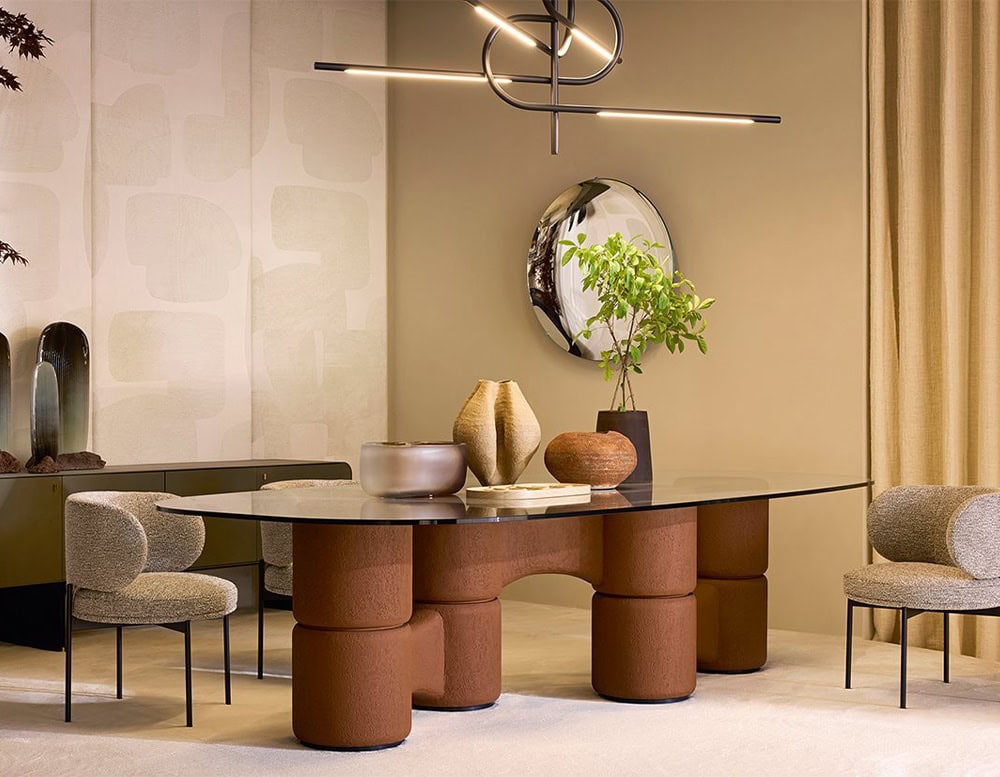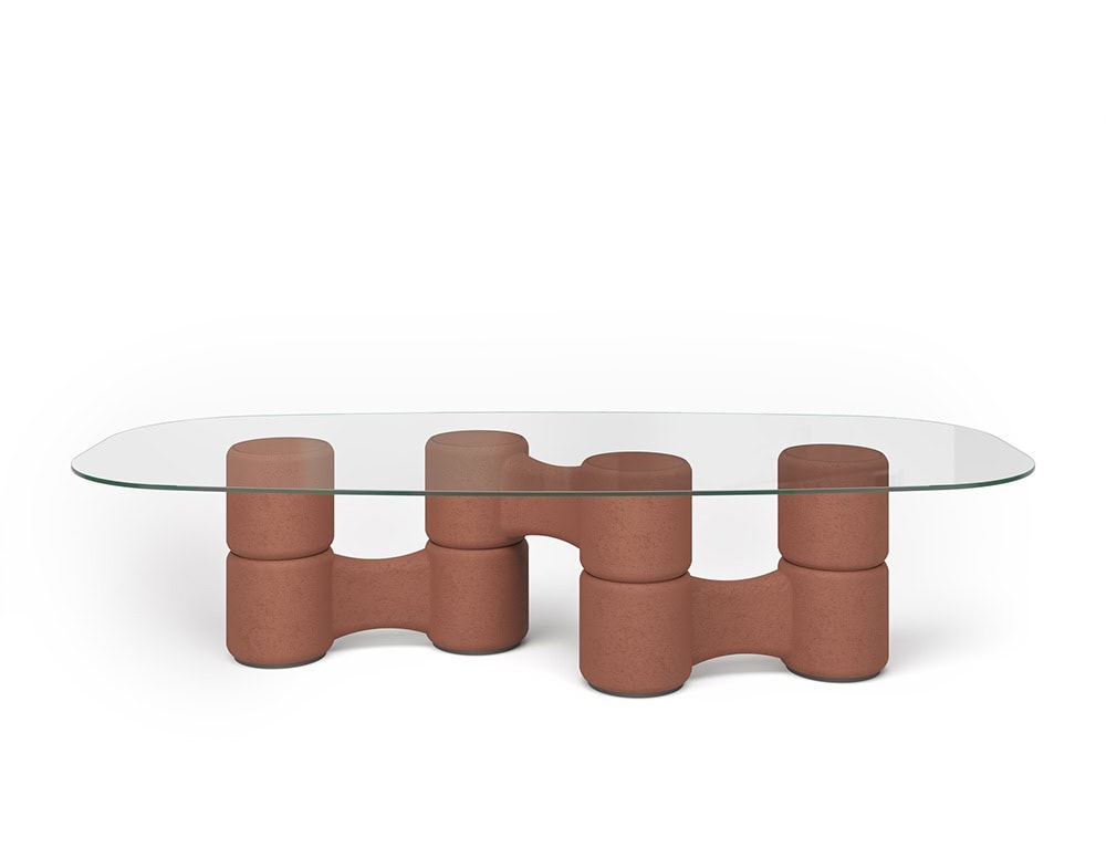 Table with 15mm transparent tempered glass top. Hand-brushed wooden cylinders base. Available in brick, rope, charcoal or ivory colours.