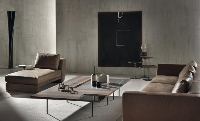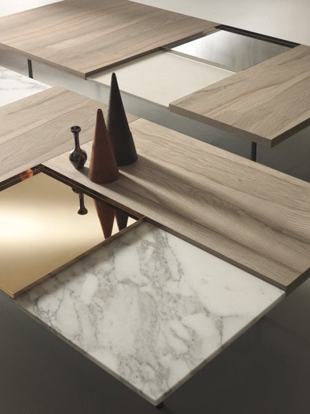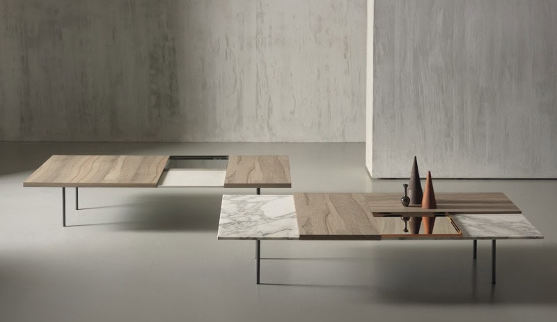 The MOODBOARD program, the first project designed by Massimo Mariani for Acerbis, is a family of small tables of versatile construction and composition that gives life to a new visual and material code dedicated to the living room: wood, marble, cement and shiny metals, creating a mosaic of materials differing by type, color nuances, texture and thickness. The search for graphic and material compositions with a strong personality creates a continuous play of color combinations and a surprising rhythm for a collection that uses color, material and form as the inspiration and synthesis for any design expression for either private or contract use. In different sizes, rectangular or square, with a supporting structure and feet painted matte dark grey, the tables can be freely combined with each other to compose large coffee tables with tops in Swamp Oak or Swamp Ash wood, in white arabesque or grey graphite marble, and in white or dark grey cement with matte finishes. A polished steel or brass tray, the thickness of which is designed to match perfectly with the different thicknesses of the table tops, can be added as a valet or utility tray.