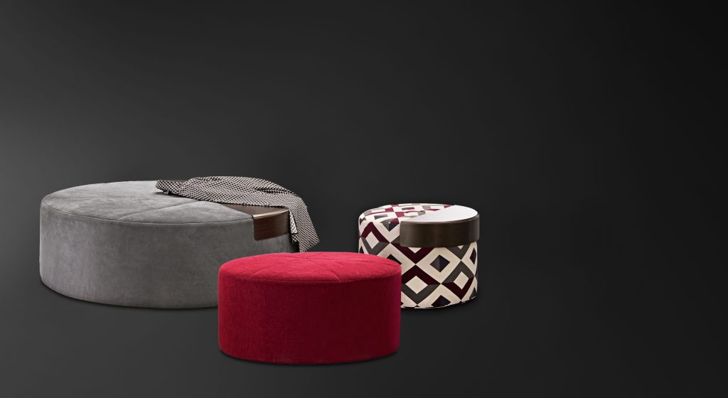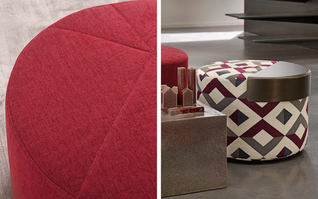 A series of circular poufs, characterised by eyecatching asymmetrical stitching.