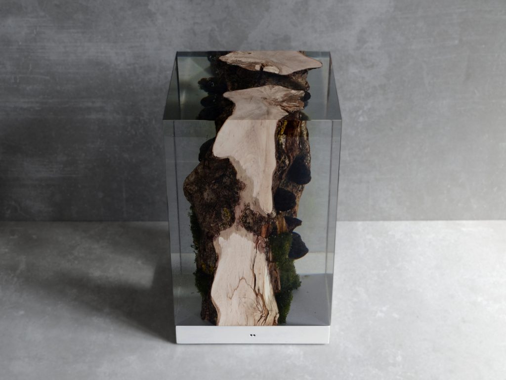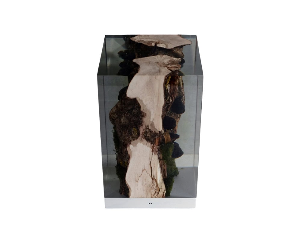 The project engages with the alcarol concept of environmental cross-section. By filling the gaps with resin, alcarol achieves a new functionality freezing time at the end of the materials cycle and giving it a new life before it dissolves into the ecosystem.Moss _ Lamp is made of SOLID WOOD with live mossy edges, preserved in EXTRACLEAR RESIN resembling the water that generated their life. The base is in STEEL in beige color. The light is provided by an integrated LED system, dimmer metal touch.