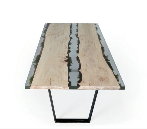 Moss _ Table is made of two SOLID WOOD with live mossy edges, preserved in EXTRACLEAR RESIN resembling the water that generated their life. The legs are in BURNISHED STEEL.
