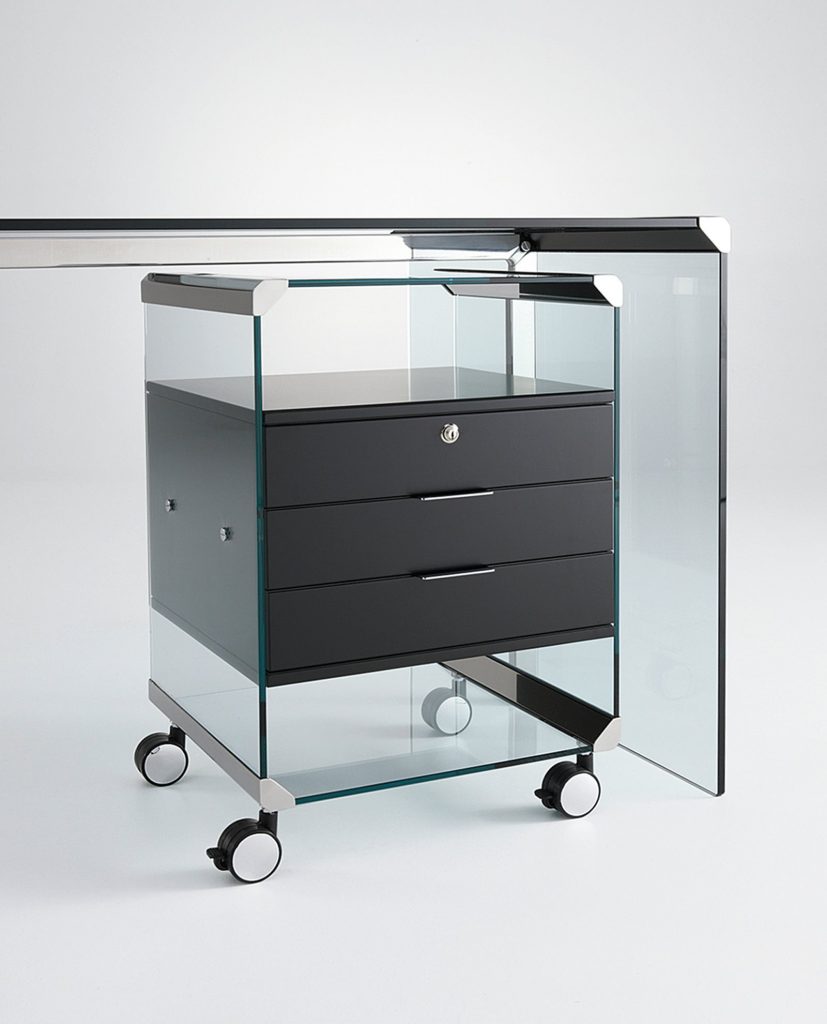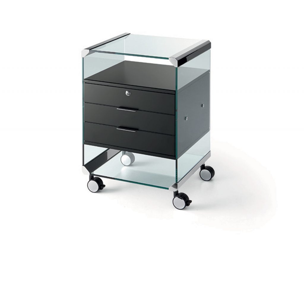 Drawer unit in 8 mm transparent tempered glass. Black, white or dark grey lacquered closed pore wooden drawers. Lock on the first drawer only. Bright stainless steel metal parts. Satin stainless steel, bright or satin brass or embossed white or black lacquered metal parts, on request. Castors with brake.