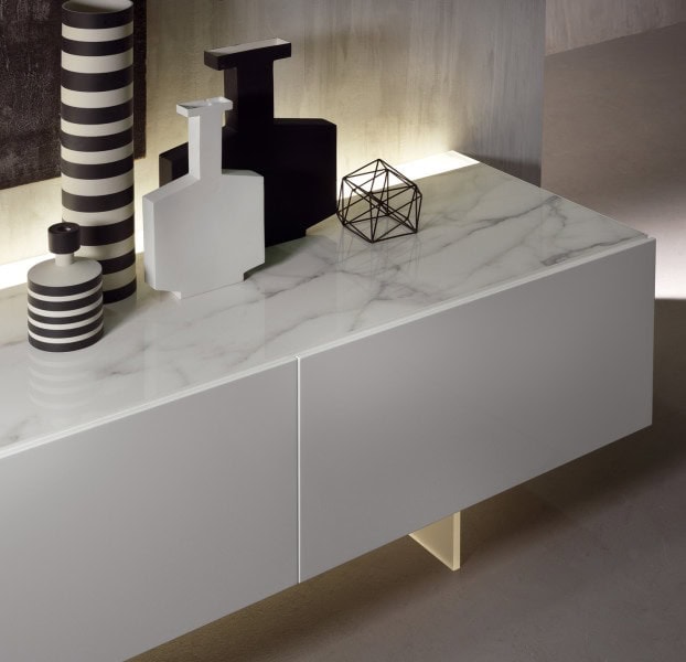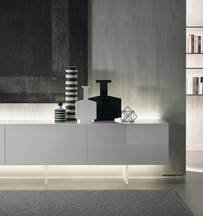 A family of sideboards characterised by a back-lighting system that enables the light to be diffused simultaneously from the upper part through a strip in matte methacrylate, inside the compartments and from the lower part. The volume of the unit, bathed in the light, appears to be suspended, a sensation that is heightened by the semitransparency of the matte methacrylate base.