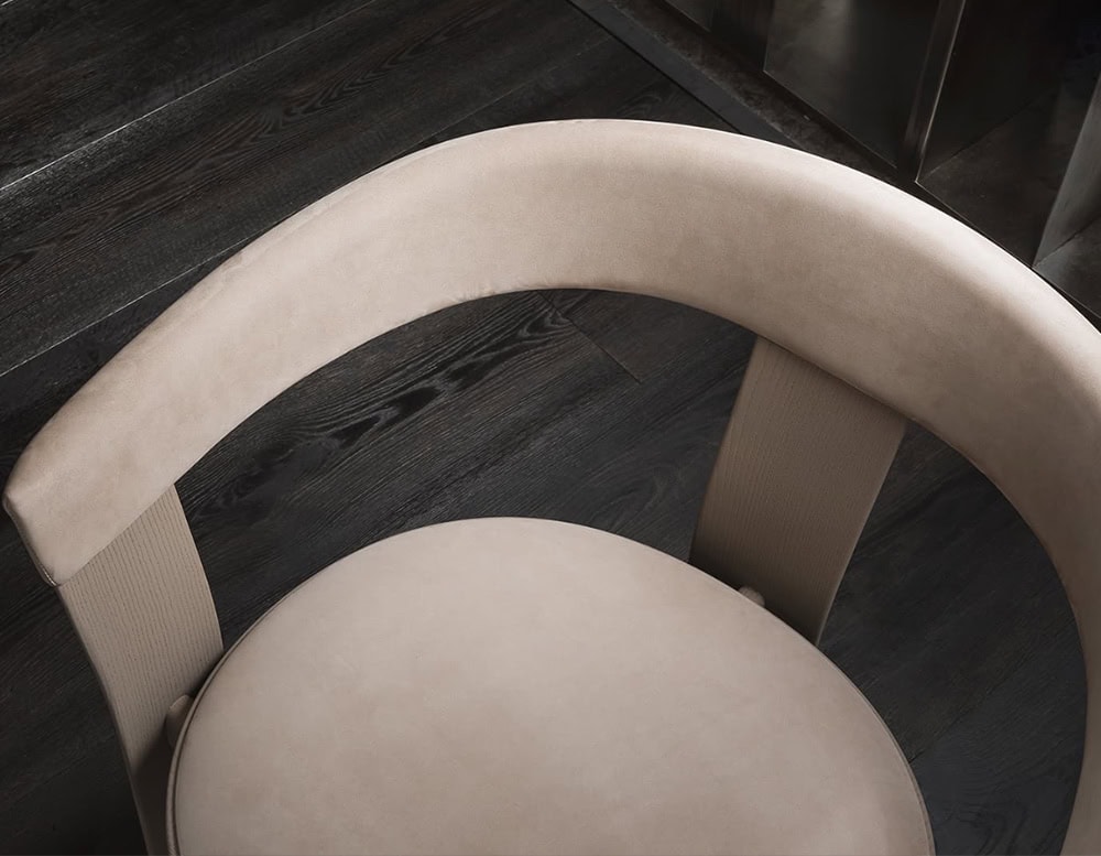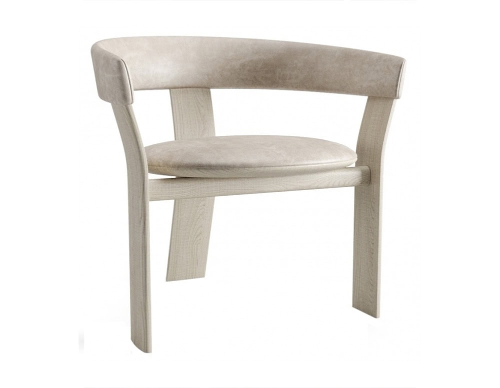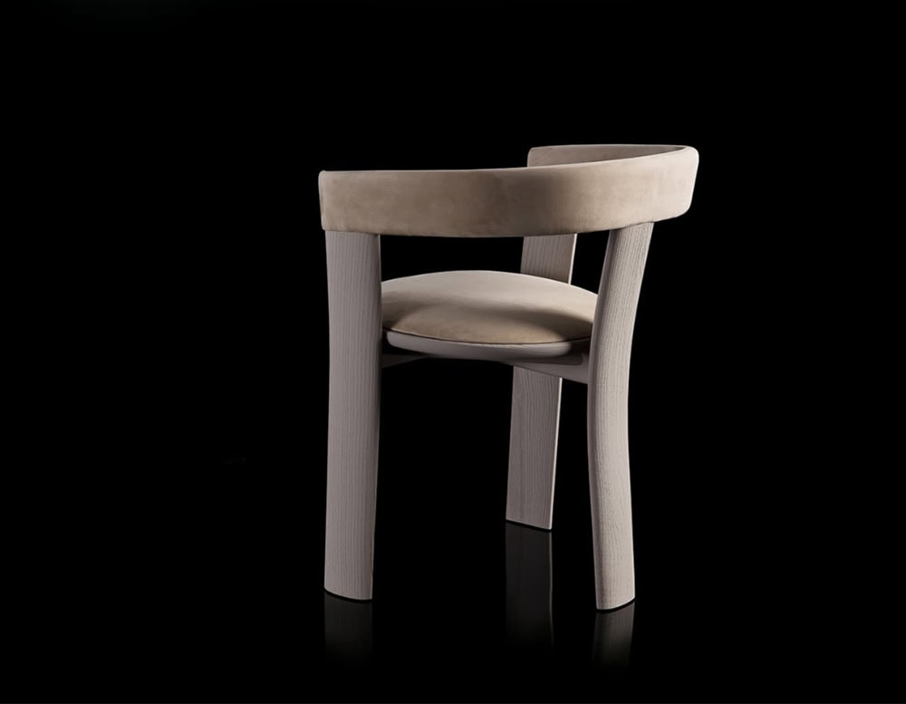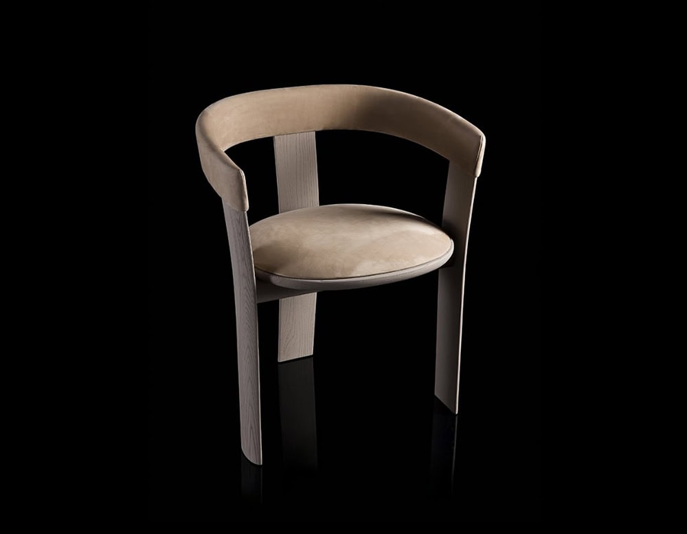 Chair with padded seat and backrest upholstered in Nabuk Shell color leather, with open pore matt lacquered wooden structure in matching color.