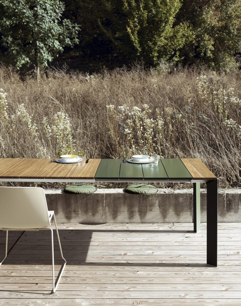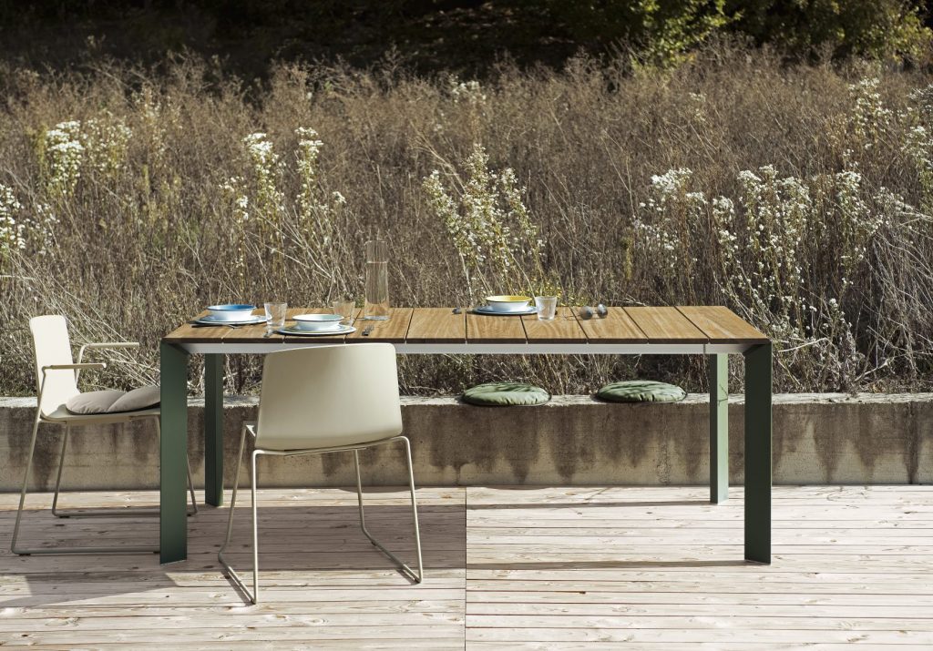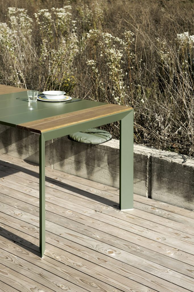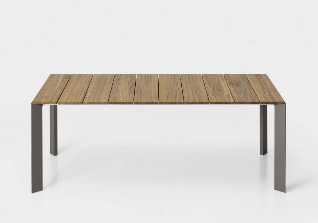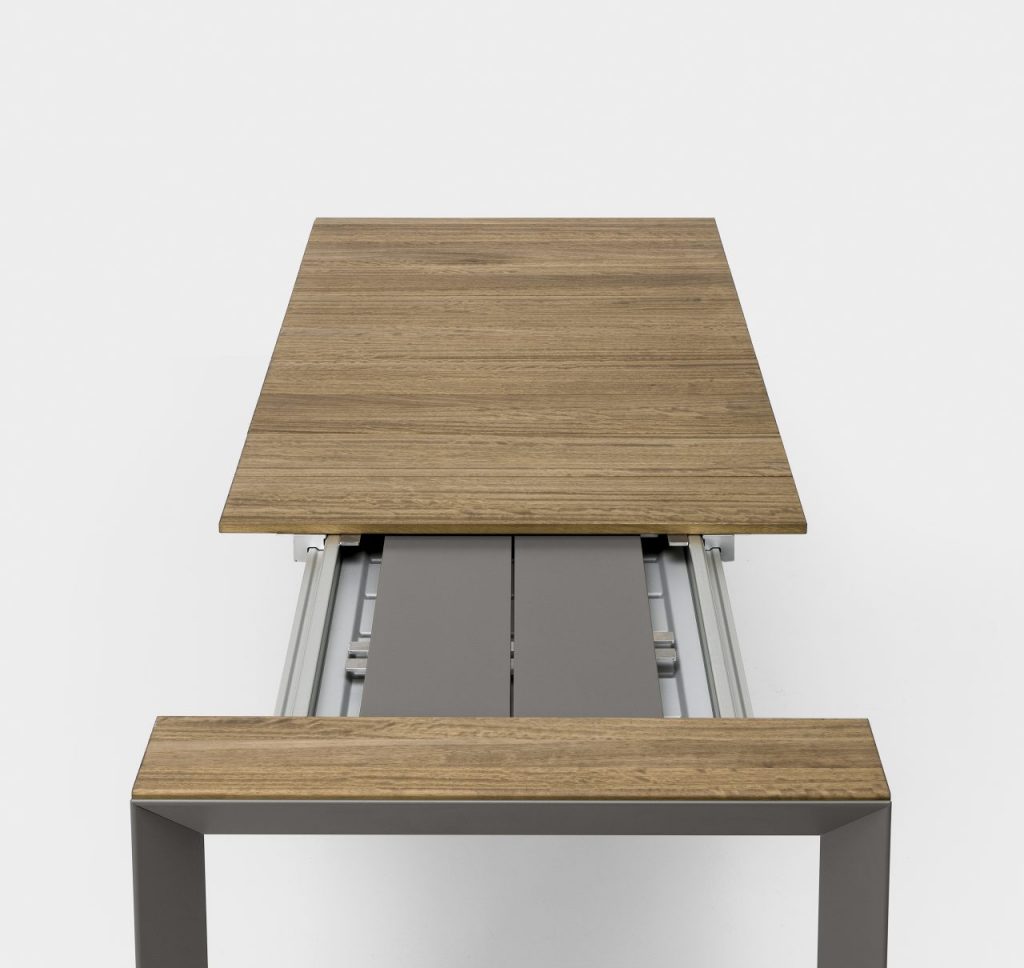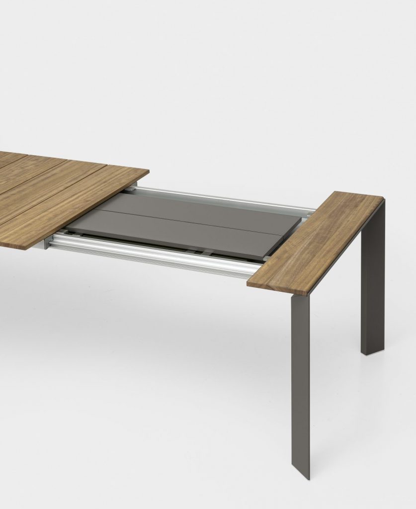 With their characteristic design, the legs of Nori tables are combined with a staved top made of Teak, FSC certified to respect the environment, which is 20 cm wide and 2 cm thick. The top can be left in its natural colour, since over time it acquires an unmistakable silvery shade, or it can be treated with oil to resume its original colour. It is also available with drawn aluminium extensions, housed in a special compartment.