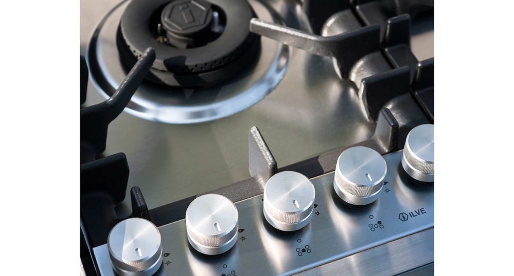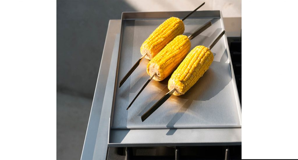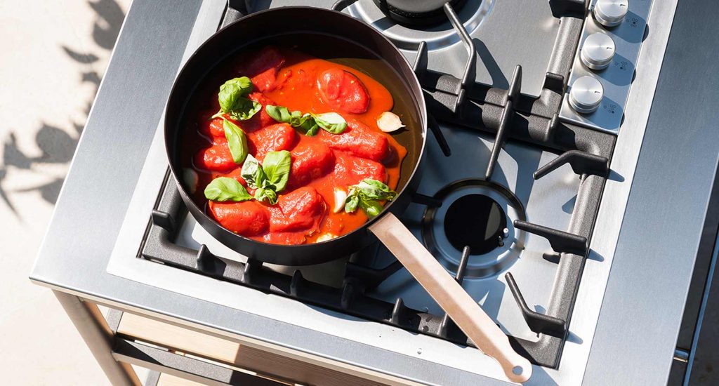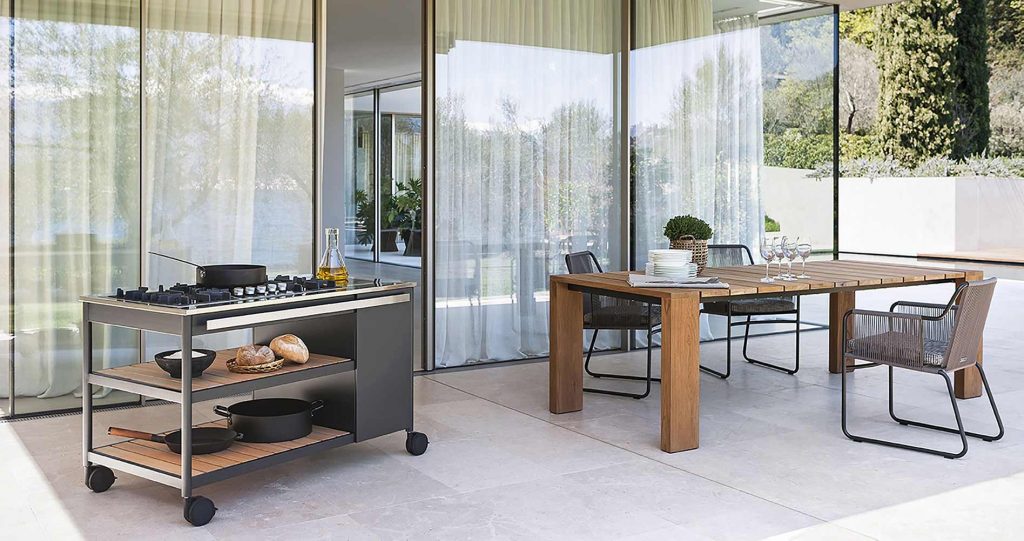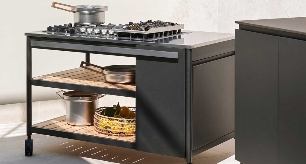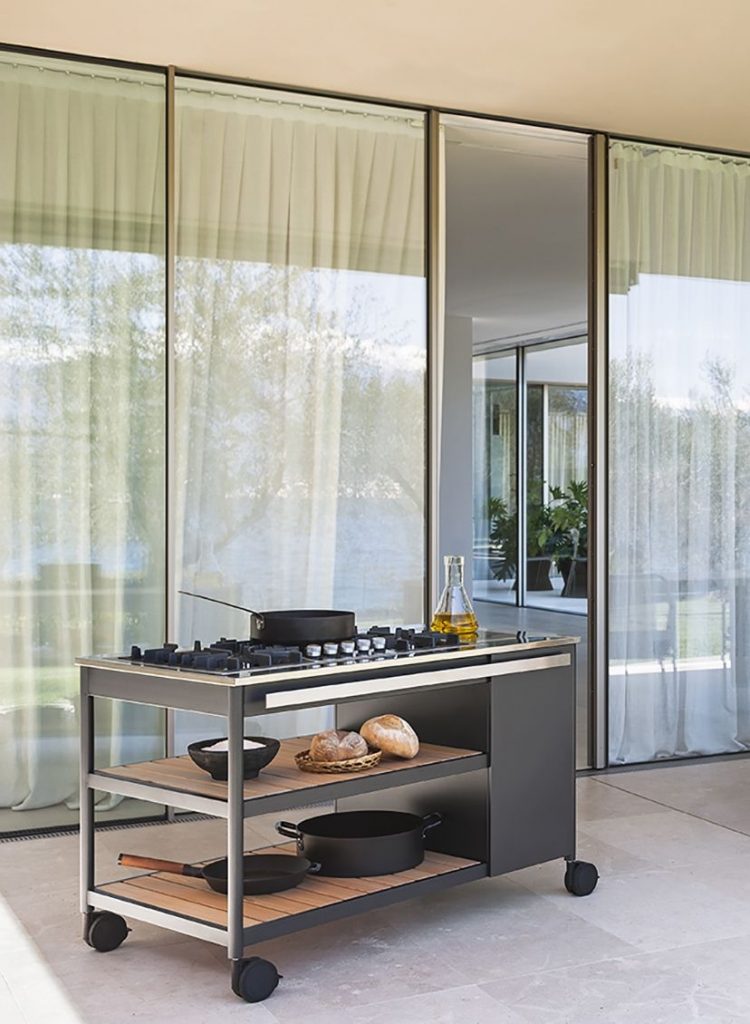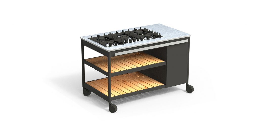 The gas cooker unit has triple crown and five gas burners, it is independent of the other kitchen components, with the option of fixed feet or wheels so it can be moved as desired and returned, if needed, to below the peninsula countertop. The space under the gas burner, with larch-wood shelves and a practical utensil rack, means everything you need is to hand. The optionals include stainless steel fry-top plates and larch-wood cutting boards that fit perfectly on the worktop.