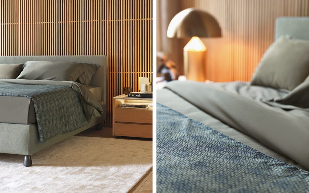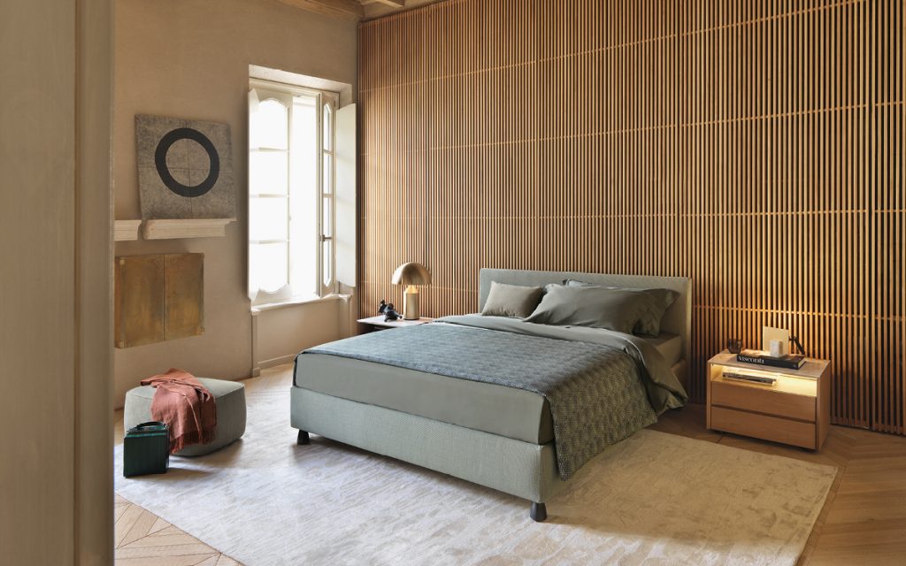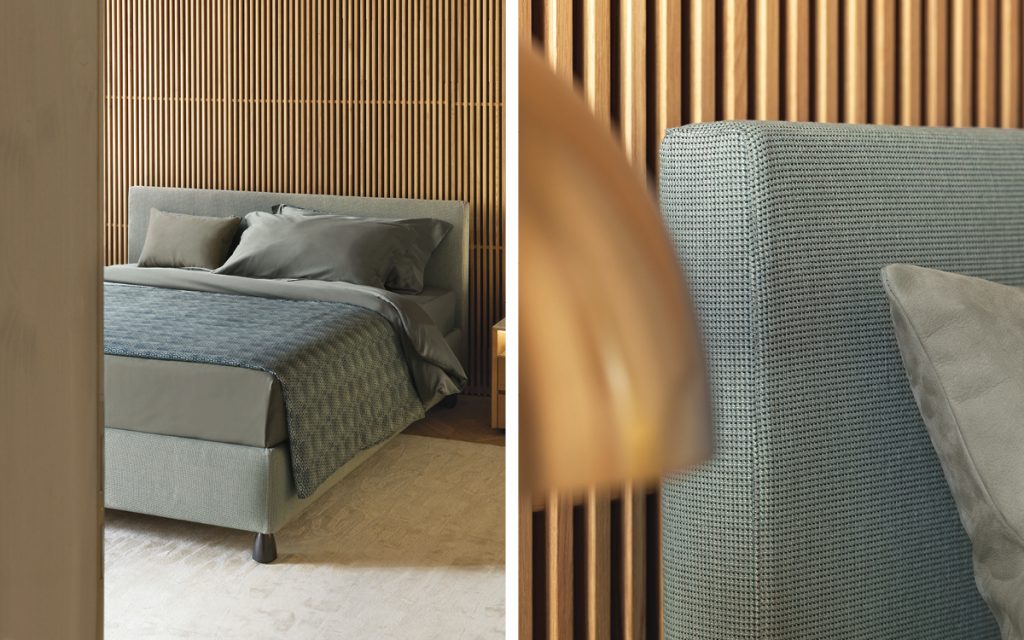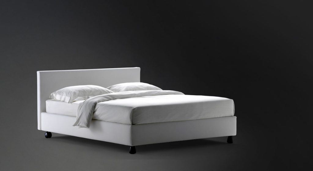 Bed with simple and essential lines. Available with box-spring base Leonardo, storage base, fixed base h 25 cm or h 16 cm, and with electrical movements. The headboard is available in two heights and, like the base, is upholstered with removable fabric, leather or Ecopelle cover with Velcro fastenings.