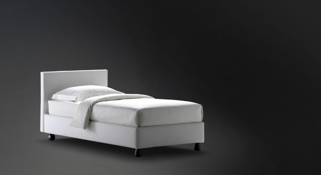 Bed with simple and essential lines. Available with box-spring base Leonardo, storage base, fixed base h 25 cm or h 16 cm, and with electrical movements. The headboard is available in two heights and, like the base, is upholstered with removable fabric, leather or Ecopelle cover with Velcro fastenings.