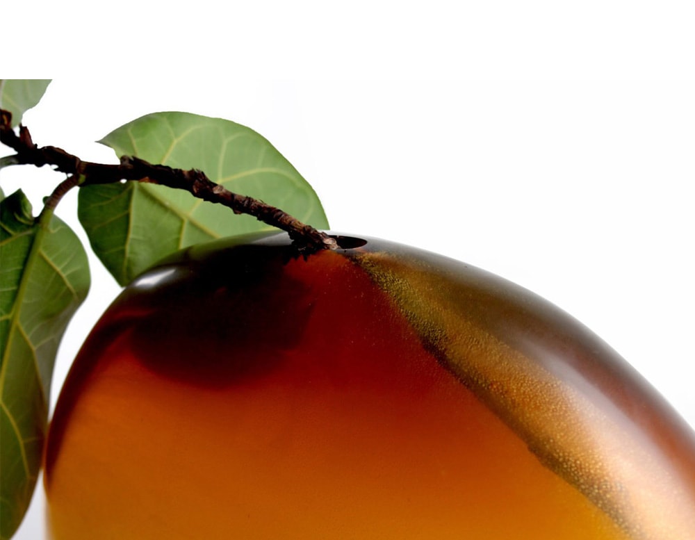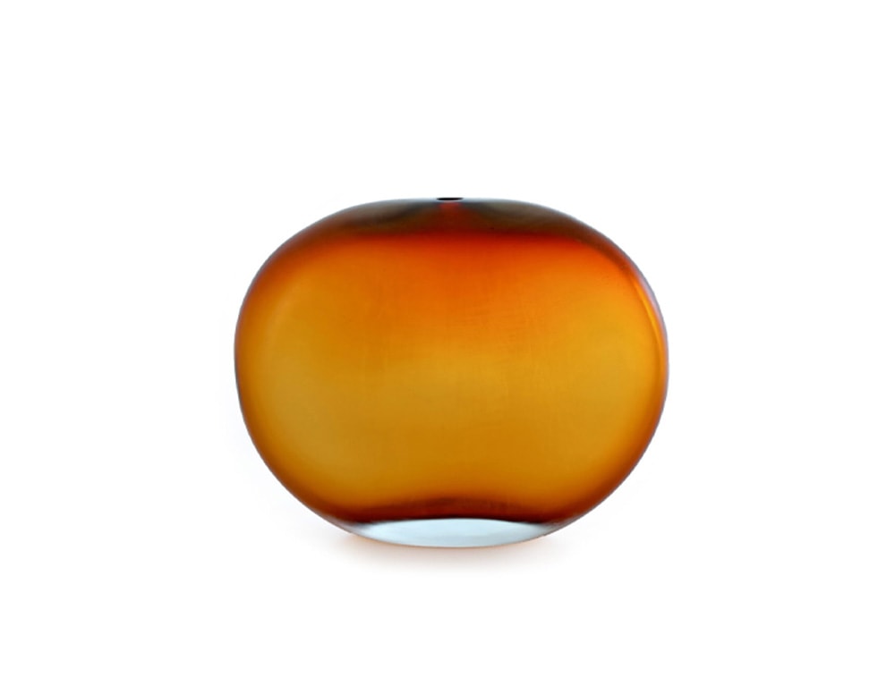 circular glass sculpture with a small hole at the top with a gradient orange color tone in a white background.