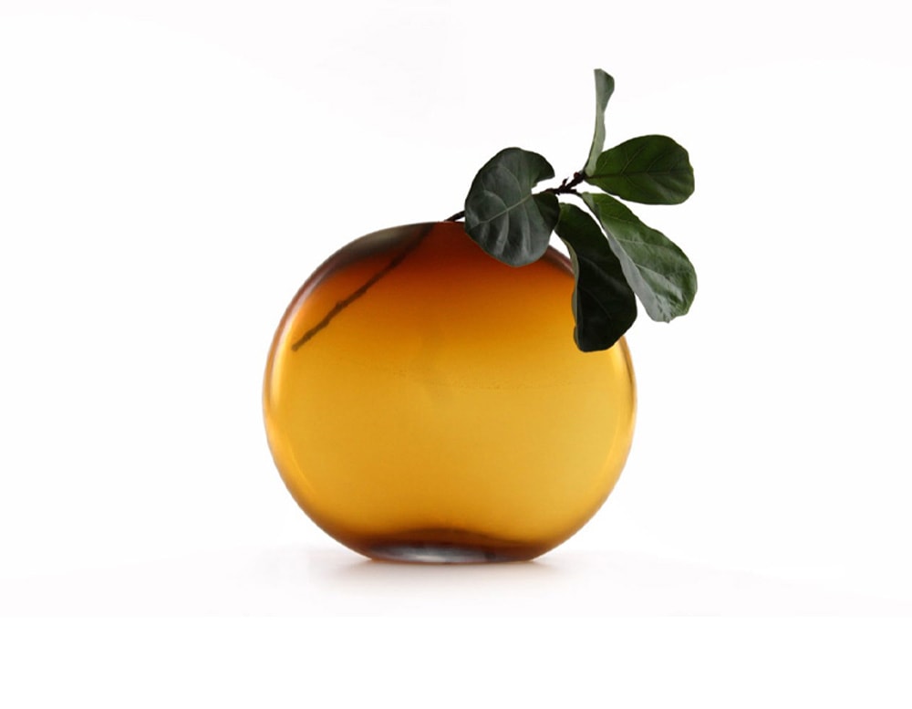 circular glass sculpture in a gradient orange tone with a hole at the top that serves as a vase.