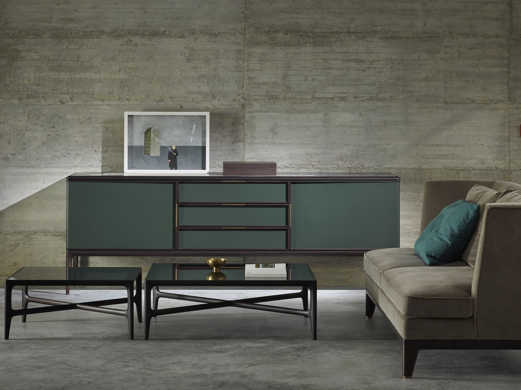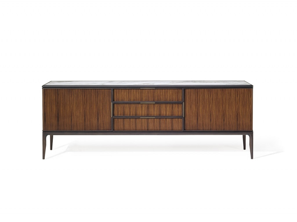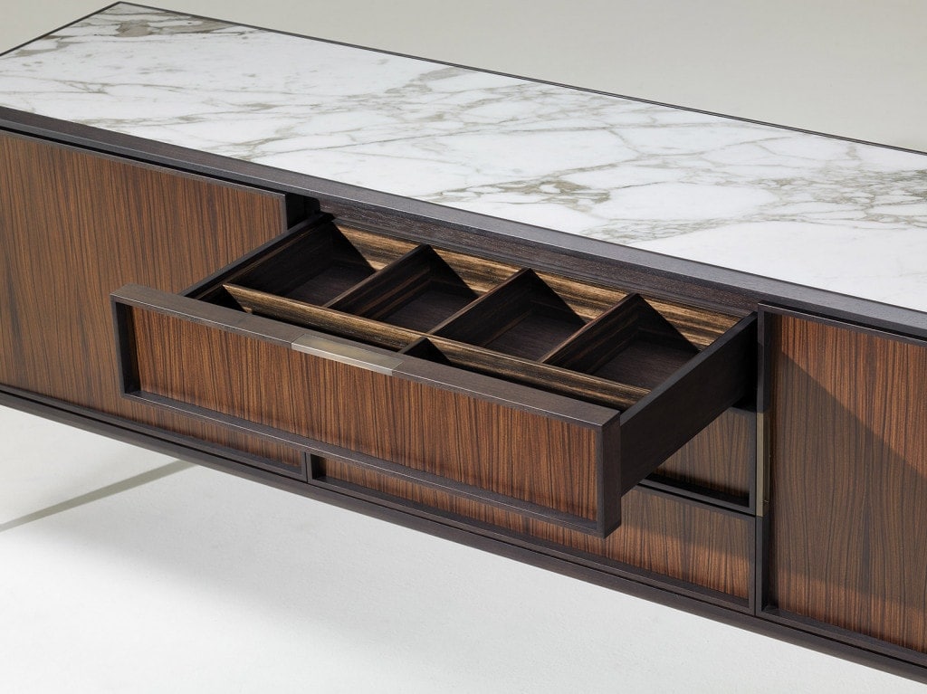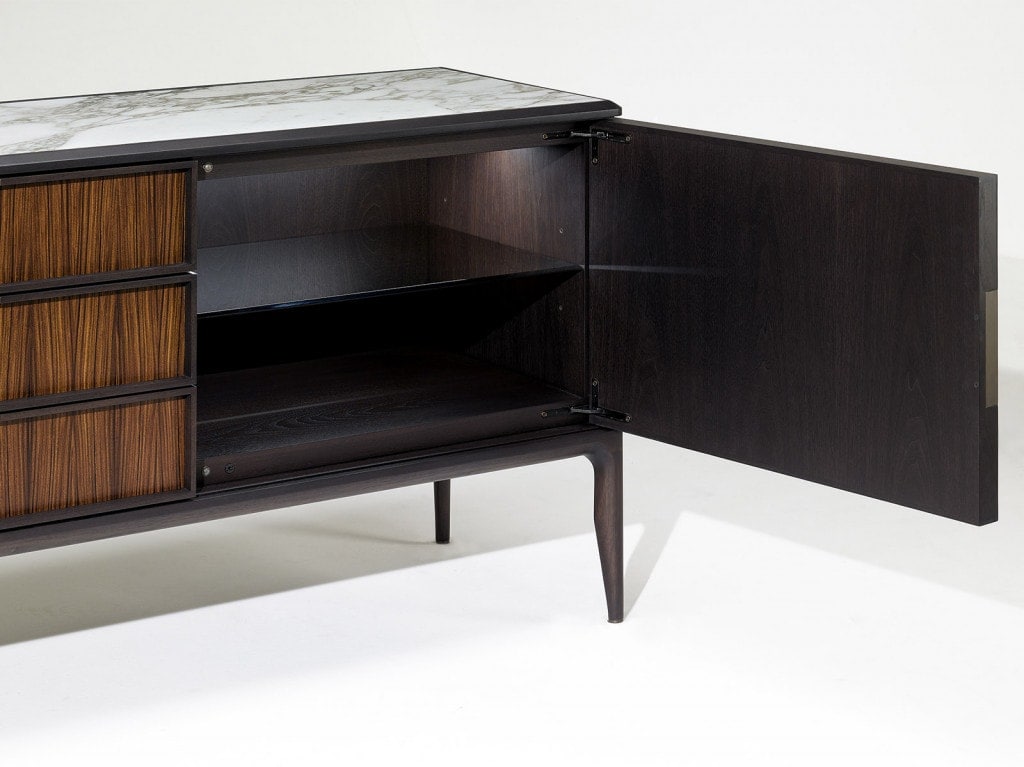 Sideboards with structure and base in solid American walnut. Doors, side panels and drawer fronts in walnut, rosewood, ebony, leather or matt lacquered. Top in wood, colored glass or marble. On request internal accessories.