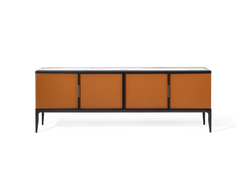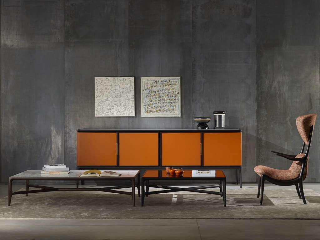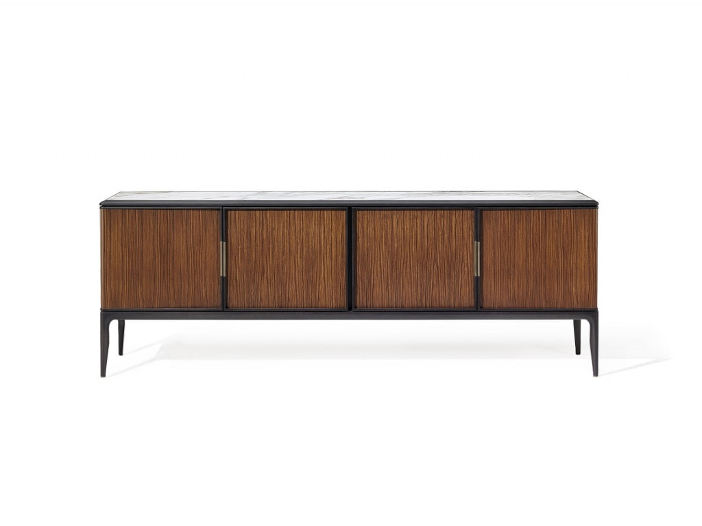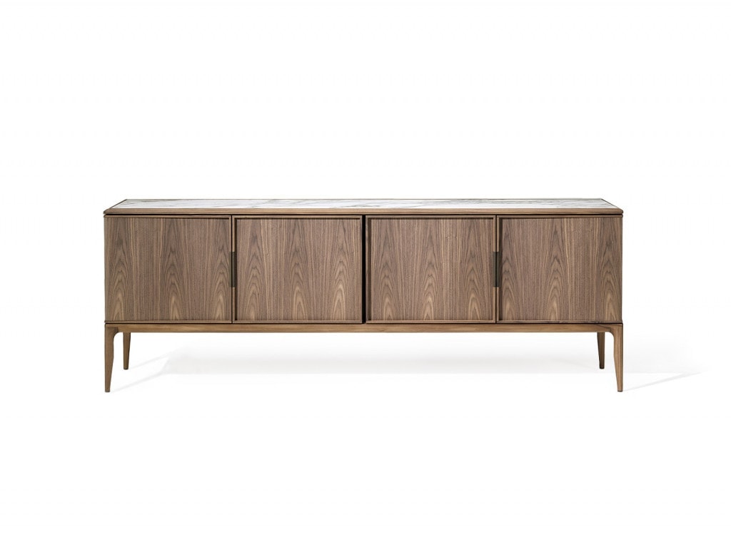 Sideboards with structure and base in solid American walnut. Doors, side panels and drawer fronts in walnut, rosewood, ebony, leather or matt lacquered. Top in wood, colored glass or marble. On request internal accessories.