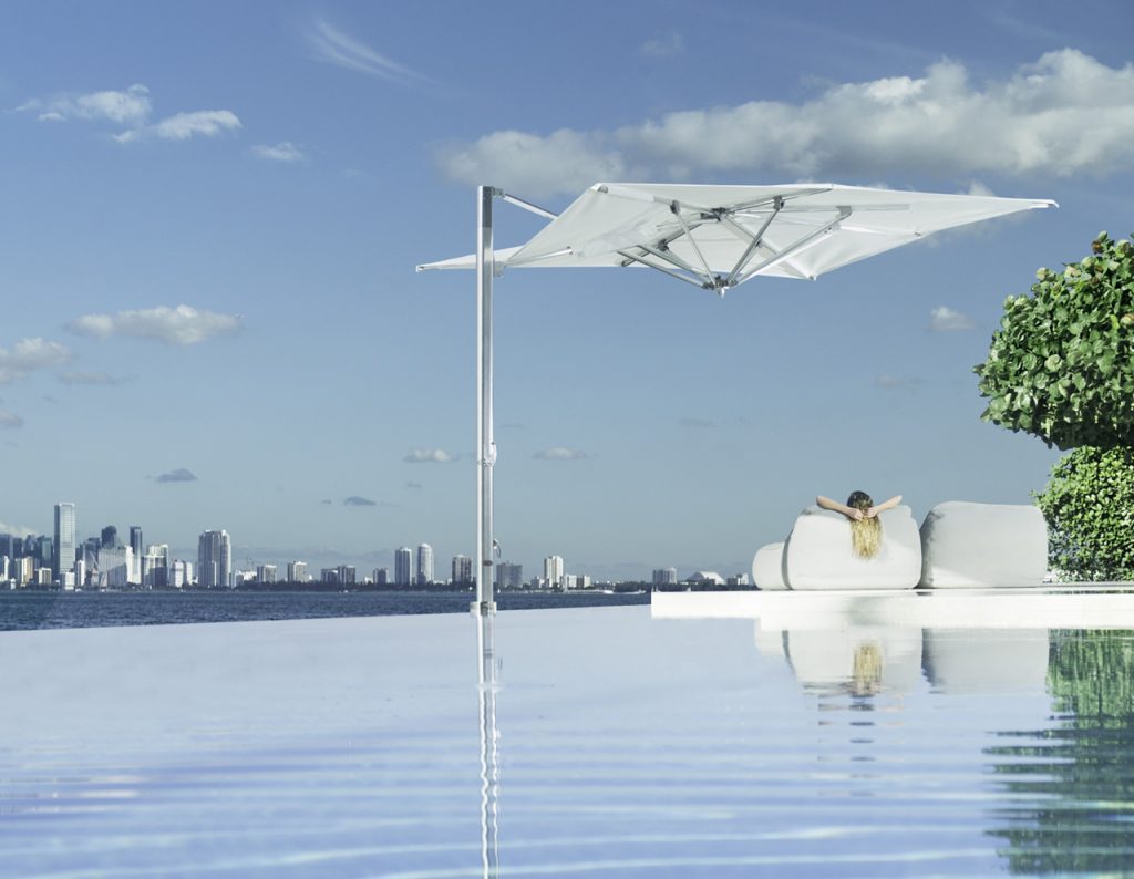 This ocean master MAX zero horizon cantilever is a minimalistic approach to shade with a striking horizontal canopy. Maintaining a zero vertical profile, the level canopy allows for an undisturbed view as it disappears into the horizon. A design never before seen with a cantilevered mast, the 10 square parasol is graceful and generously proportioned to create cool retreats with warm ambiance.