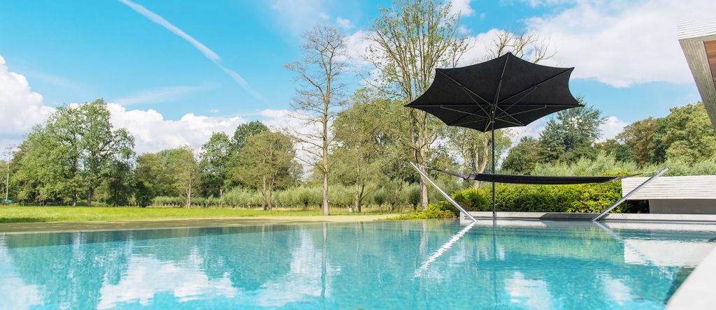asymmetrical umbrella made of metal and fabric in a black tone on a pool background