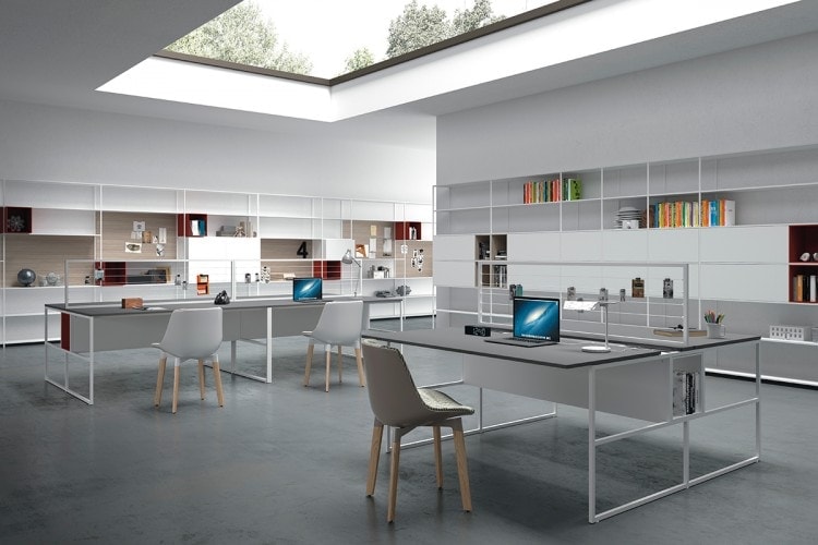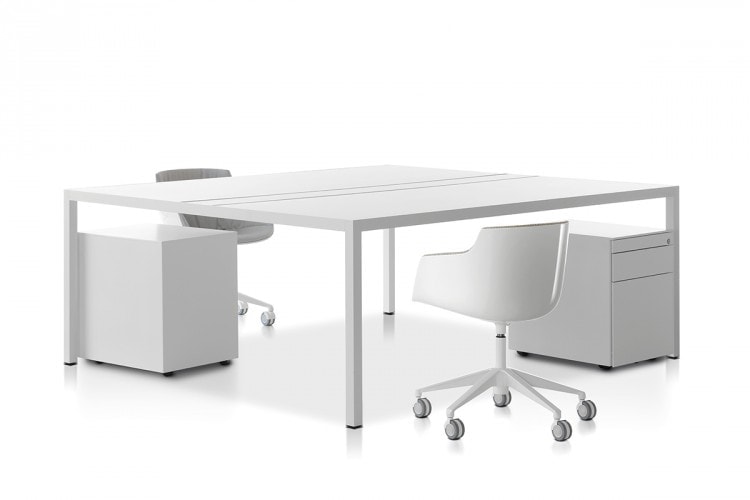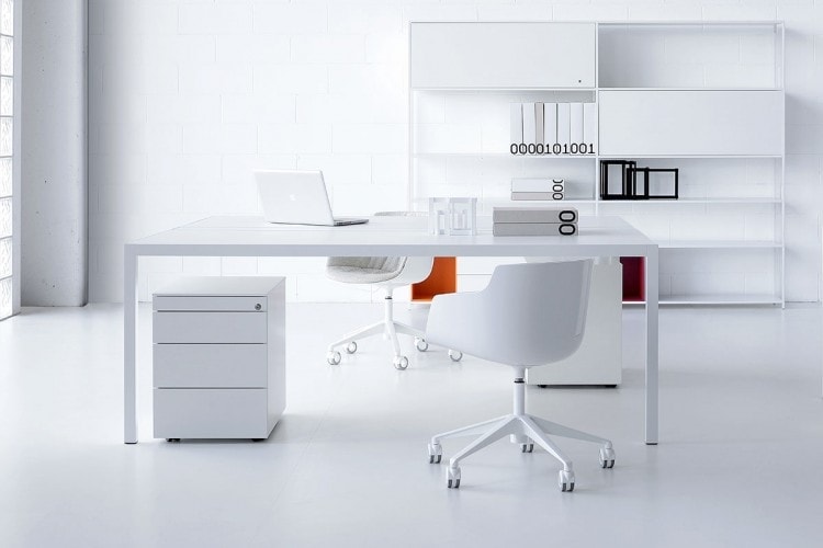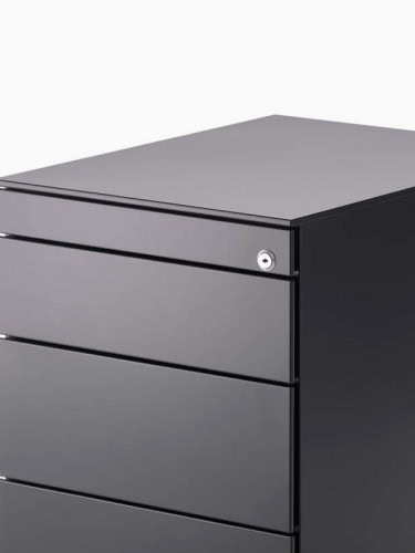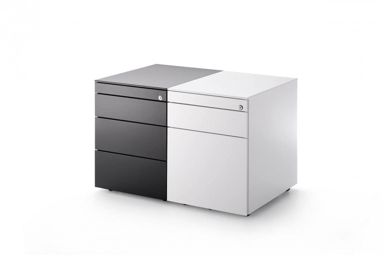 Available in the version with 3 drawer chest of drawers with lock, complete with stationery tray, with wheels and anti-tilt system. Both types are available either in white, graphite grey and medium grey, matt black inside drawers in all colour variants.