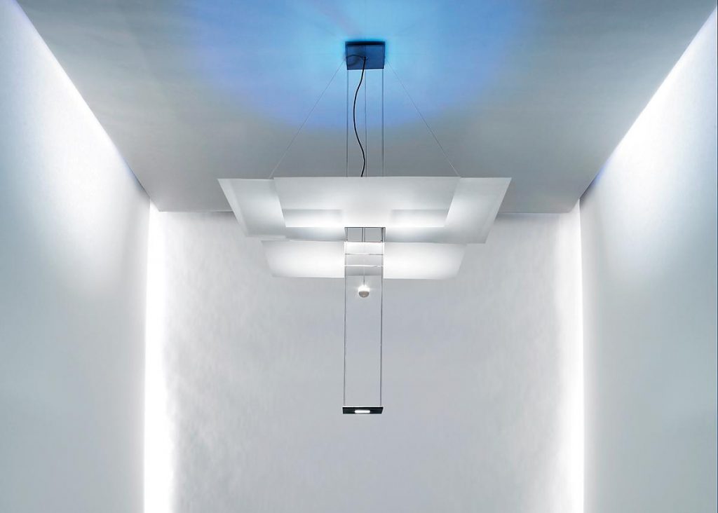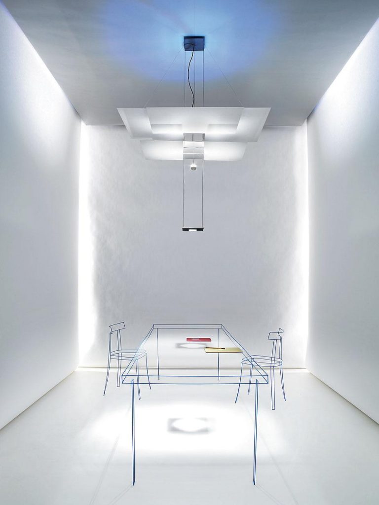 Metal, glass. Six sheets of aluminium, mat white finish.