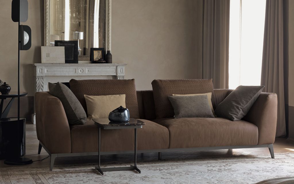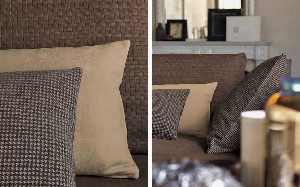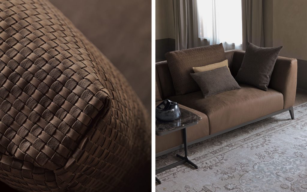Large back support cushions with covers that can be supplied in the fabrics of the Flou collection or alternately in the characteristic format in woven leather, and a range of different-sized cushions add an extra decorative touch to these beautiful sofas.