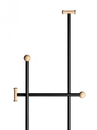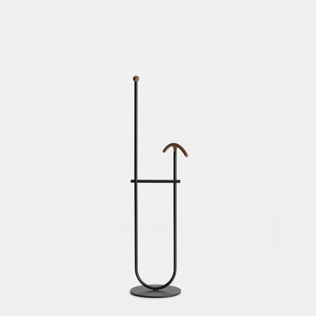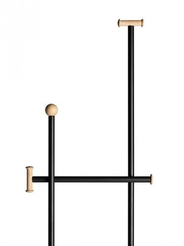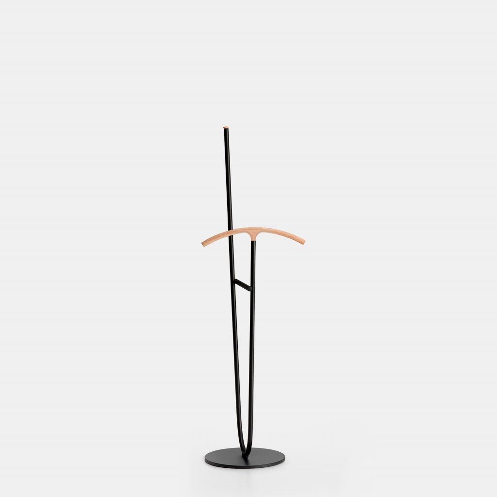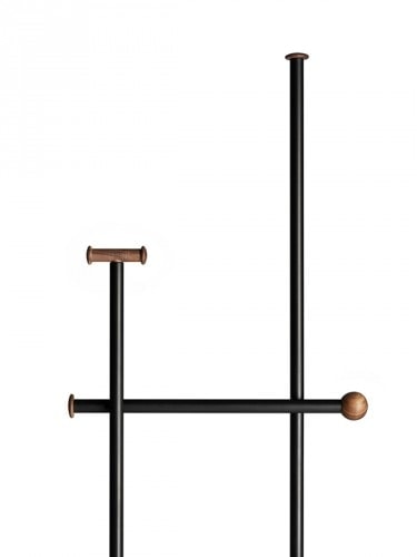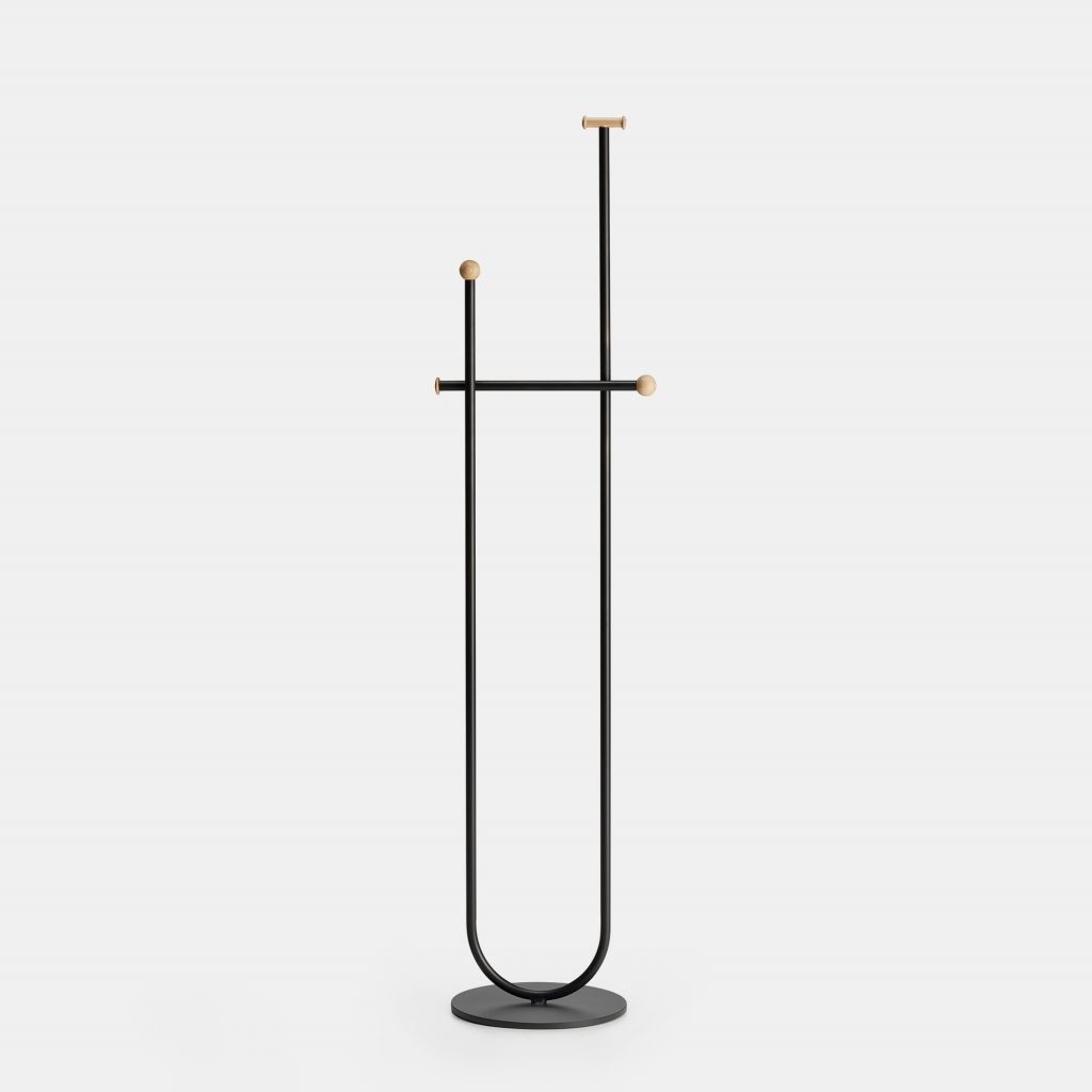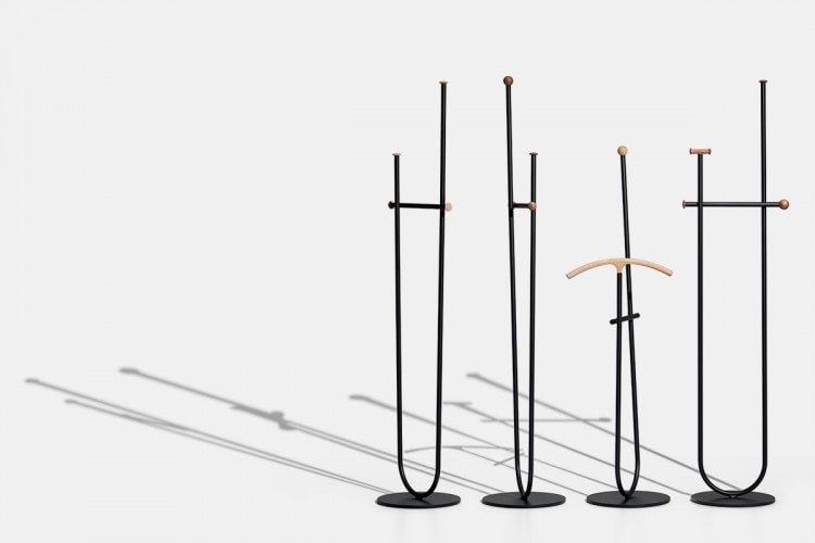 A bended tube is crossed by linear tubing; this is how many passages are created for a clothing rack and a valet stand. The metal and wood inserts interact to make the structure remind of a sculpture, as well as to give form to a practical element.