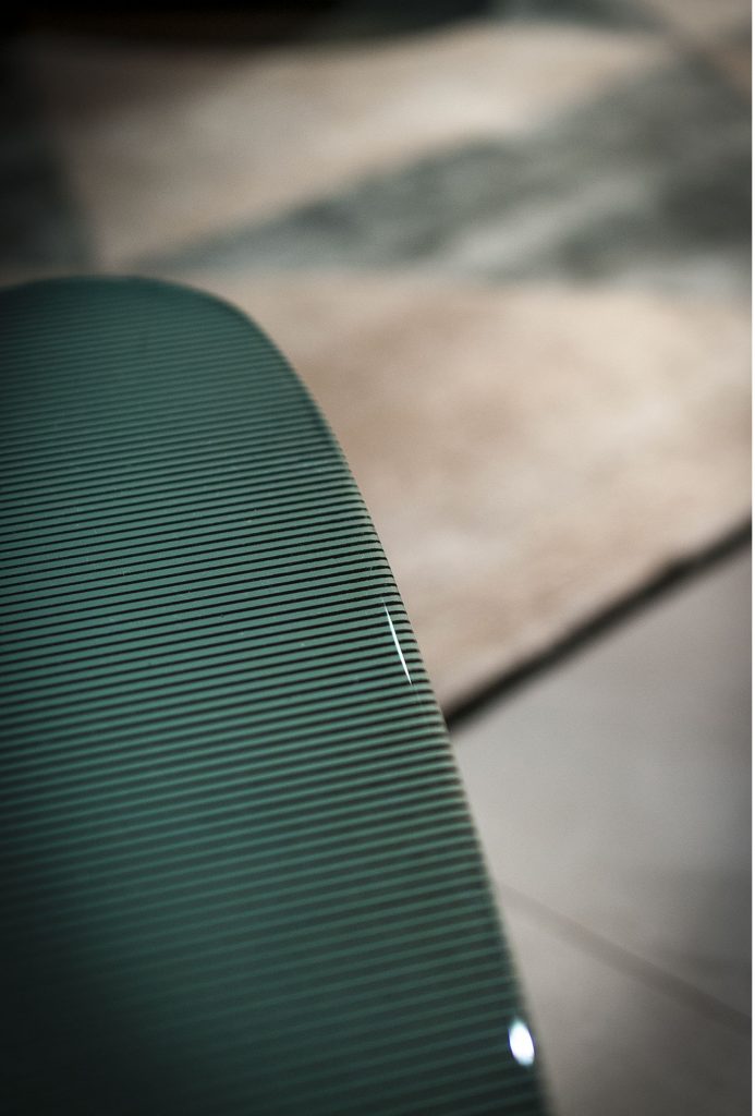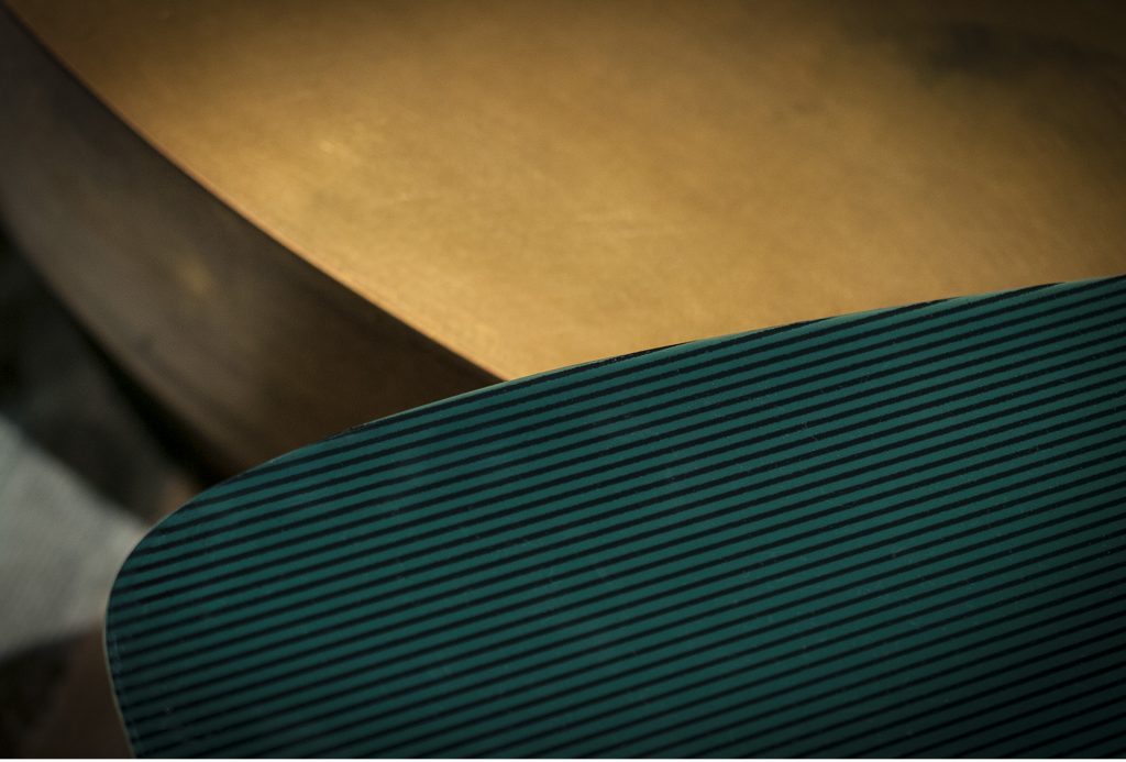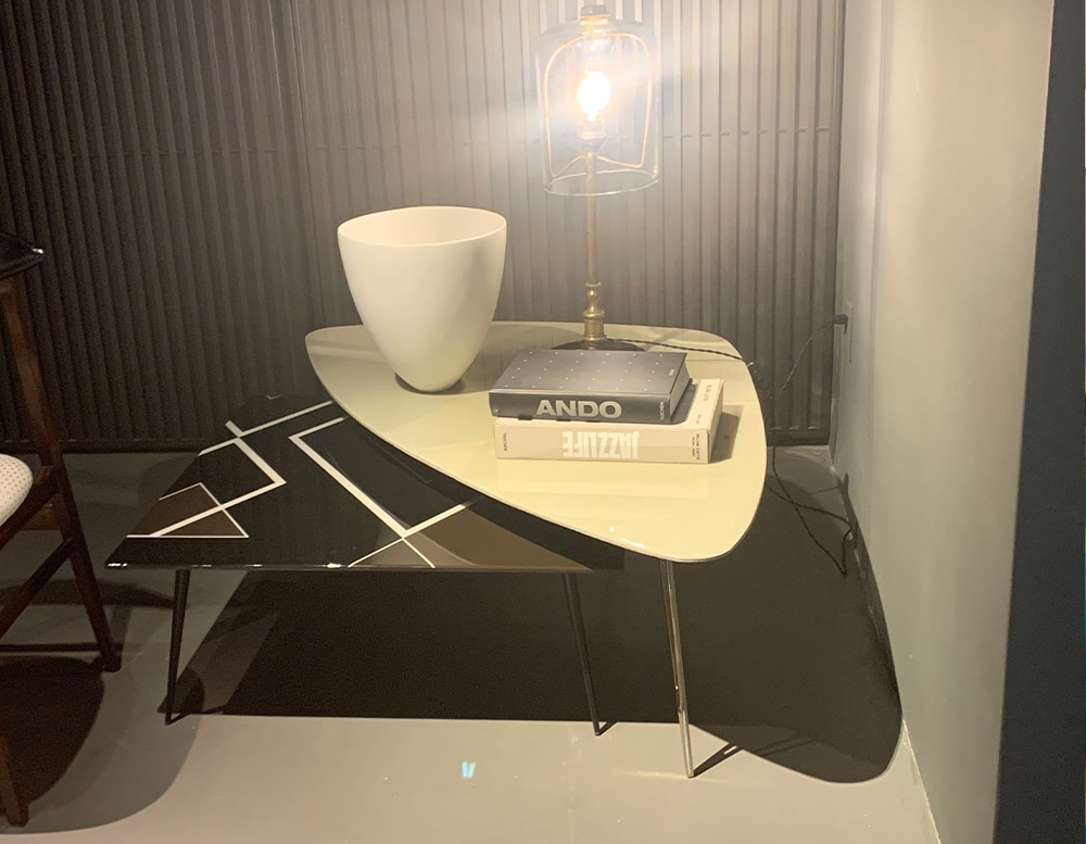 Triangular coffee table with Grey/ Pois Texture lacquered resin top and brass legs. Gray coffee table only. This product is discontinued.