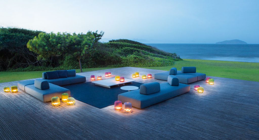 This series consists of large seating pieces completed with backrests and corner backrests which can be positioned as desired. - Structure: cataphoresis treated and varnished steel, seat provided with elastic belts; varnished stainless steel bases or plastic spacers. - Padding: stress resistant expanded polyurethane; seat area in polyester fibre and polyurethane, foam covering in waterproof polyester. - Back cushions: ballasted, in expanded polyurethane and polyester fibre, foam covering in waterproof polyester. - Upholstery: removable and available in the fabrics Luz, Rope T, Brio or Thea. - Notes: This product can be used also in interior environments. We advise to use a Winter Set protection cover.