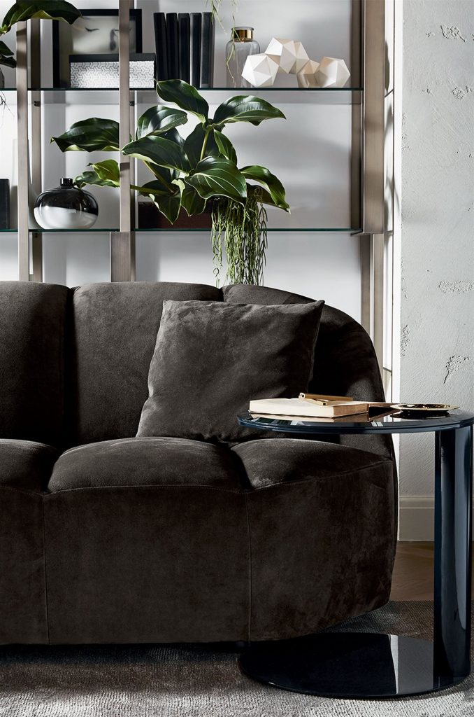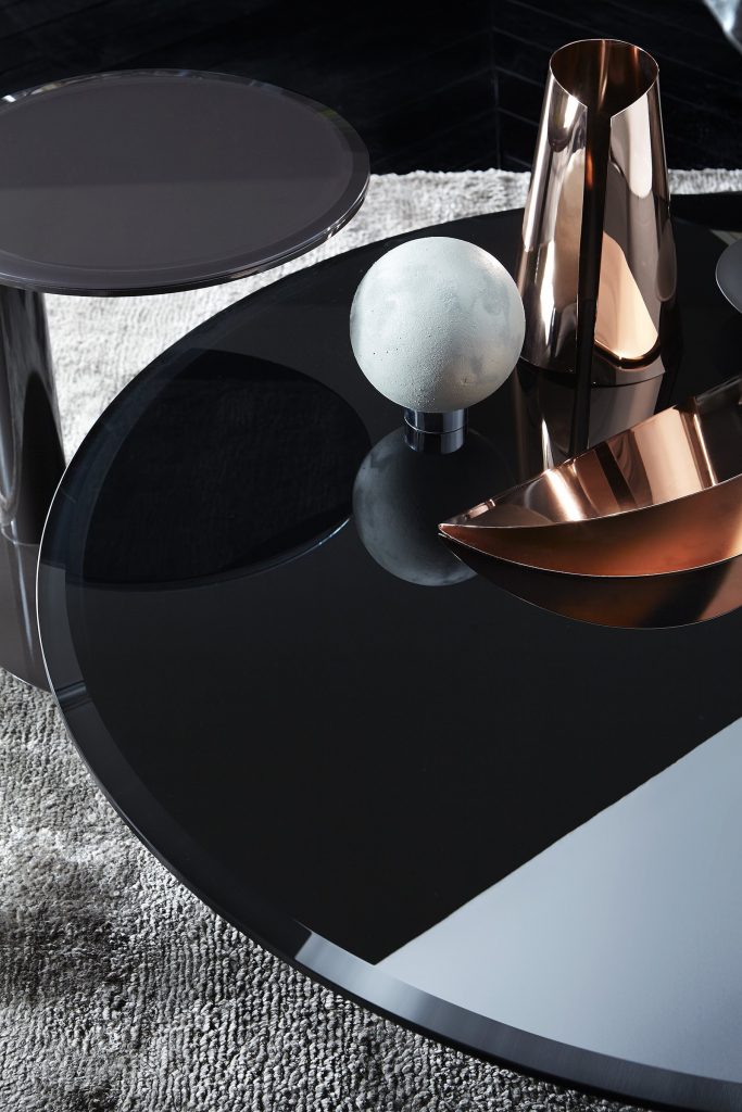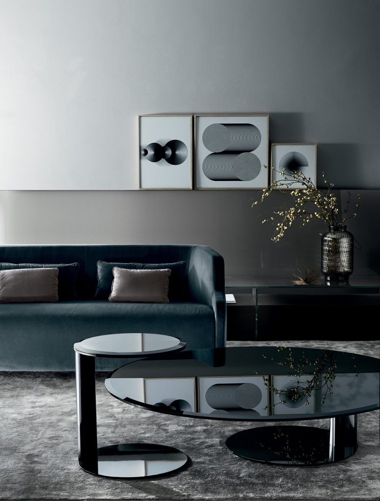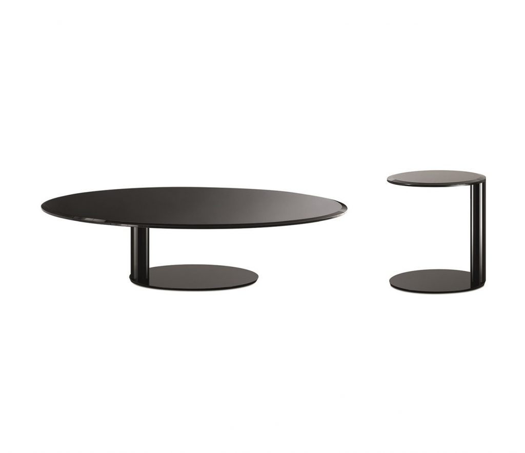 Coffee table with 10mm bevelled and bright painted glass top. Bright lacquered metal struture. Available in the colours black, blue grey and liquorice.