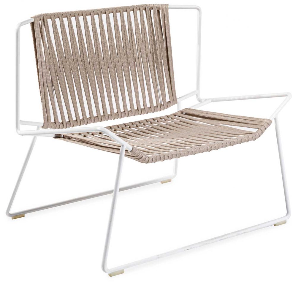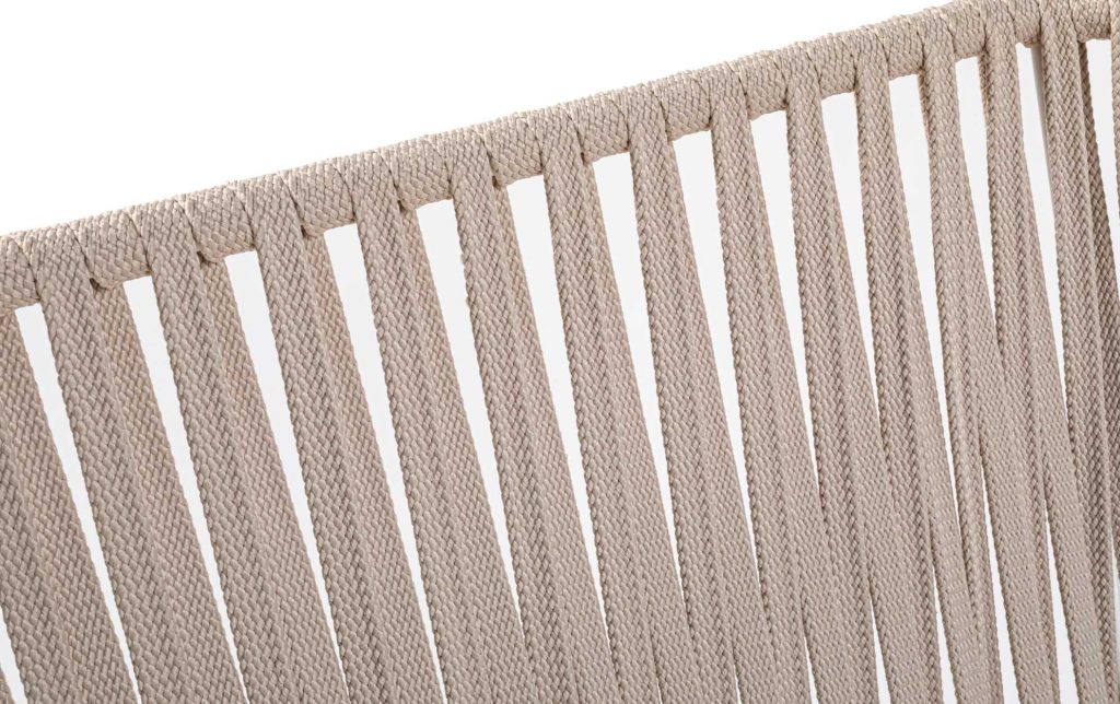 Outdoor armchair with its seat and back in a taupe braided polyester rope - taupe#507 handwoven to the structure. The chairs structure is made from steel tube, with a white powder-coat finish.