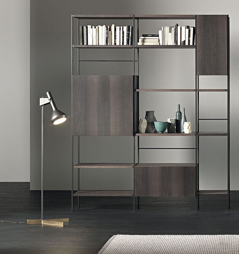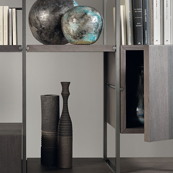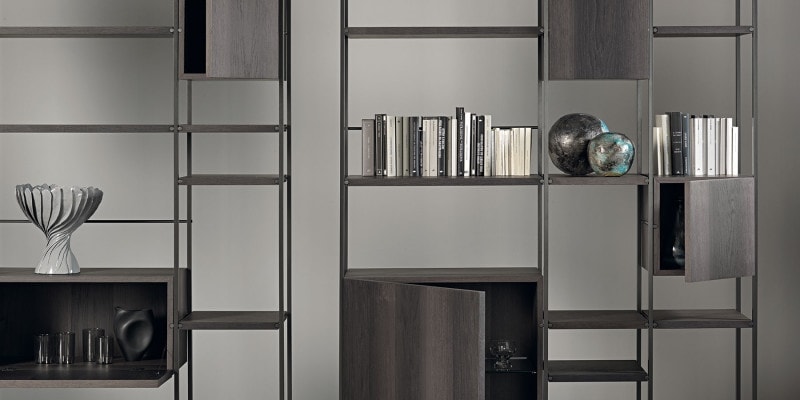 A free structure that establishes a dialogue of contrasts between the tactile sensations of the wood and the metal frame: Outline is a free-standing bookcase that creates an uneven home landscape, in which the different versions can coexist independently or side by side, creating new and different landscapes each time. The particular layout of the structure allows it to be installed against the wall or in the center of the room for a completely free use of the living room space, which combines the pleasure of maximum functionality with rigorous linear aesthetics. The unusual round recesses in the shelves and in the shoulders of the cubes allow the various elements to be inserted by sliding them into place: a structural detail that is both functional and attractive, with the visible circular forms breaking up the linearity of the structure. The visual contrast between the volumes of the cabinets and shelves and the lightness of the structure releases an energy that combines a contemporary look with that of handmade cabinetry.