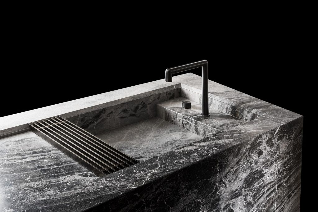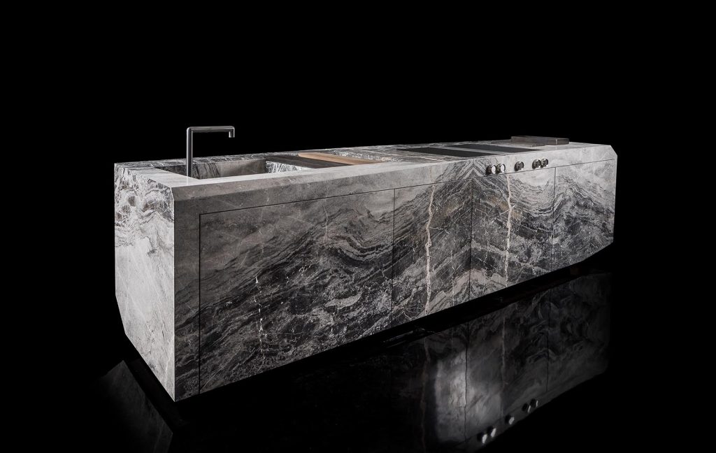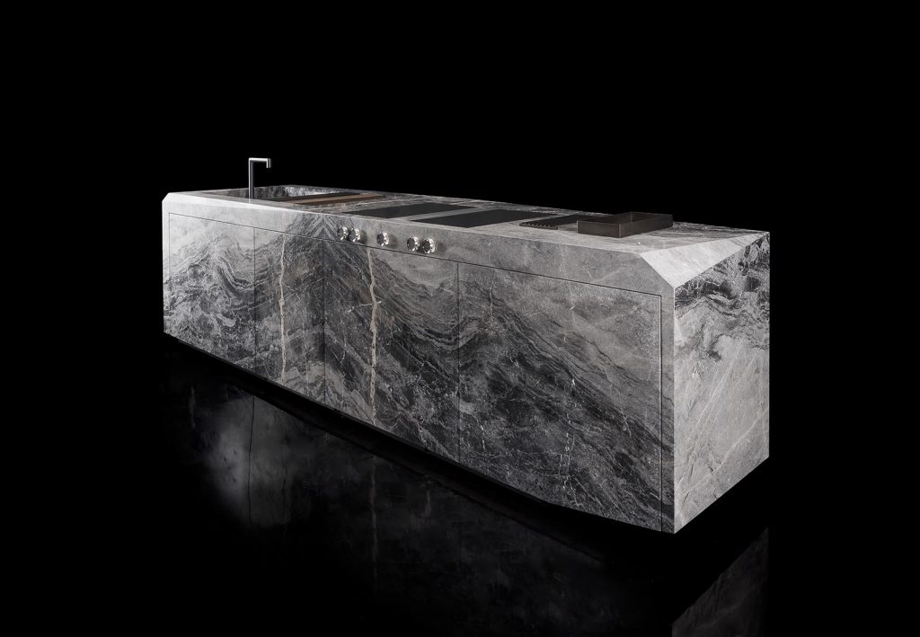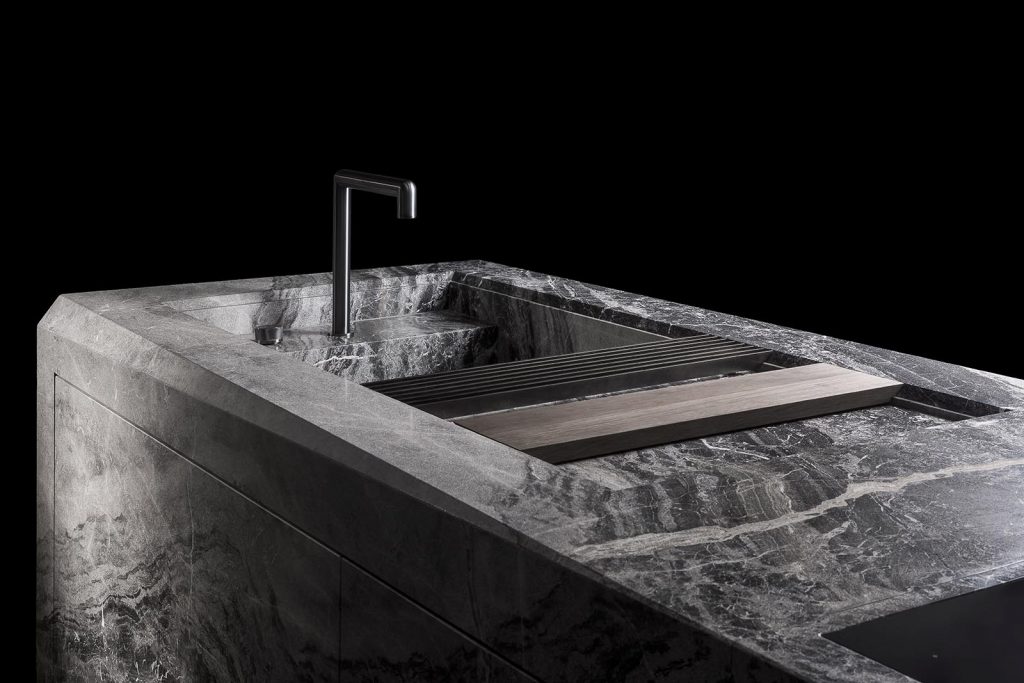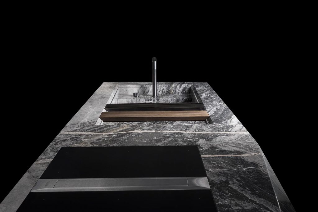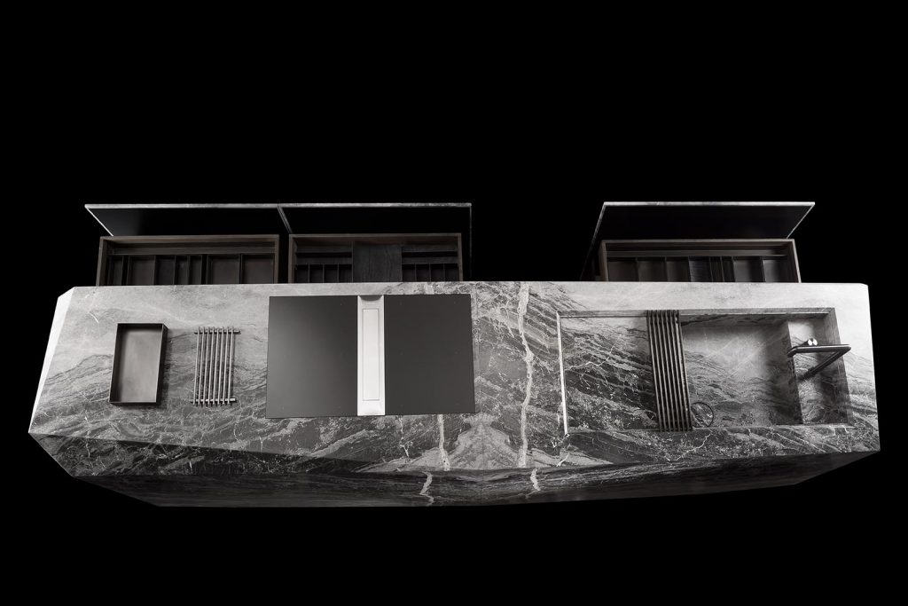 Structure external structure in stone from our range. Drawers with servo drive automatic opening system, with electrical support. Internal drawers in oak thermowood with internal partitions in lack burnished steel and bottom in leather e-type black. Predisposition for kitchen appliances and tap. - Finishes stones from our range. - Optional brass grids (trivet) - dish drainer grid with wooden chopping board - cutlery with partitions in black burnished steel - dustbin kit in stainless steel