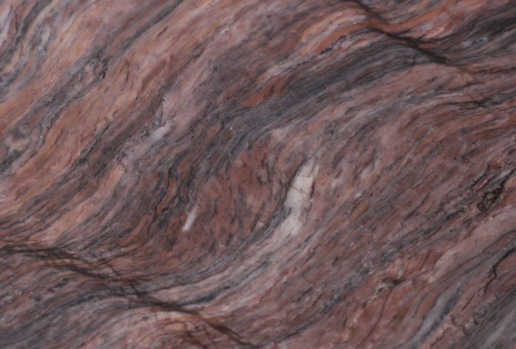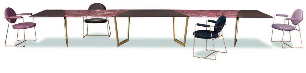 Large dining table with alternating top inserts in a red "rocky mountain quartzite" and a brown lacquer finished wood. Table base and top decorative inserts in satin-?nished brass with wax ?nish.