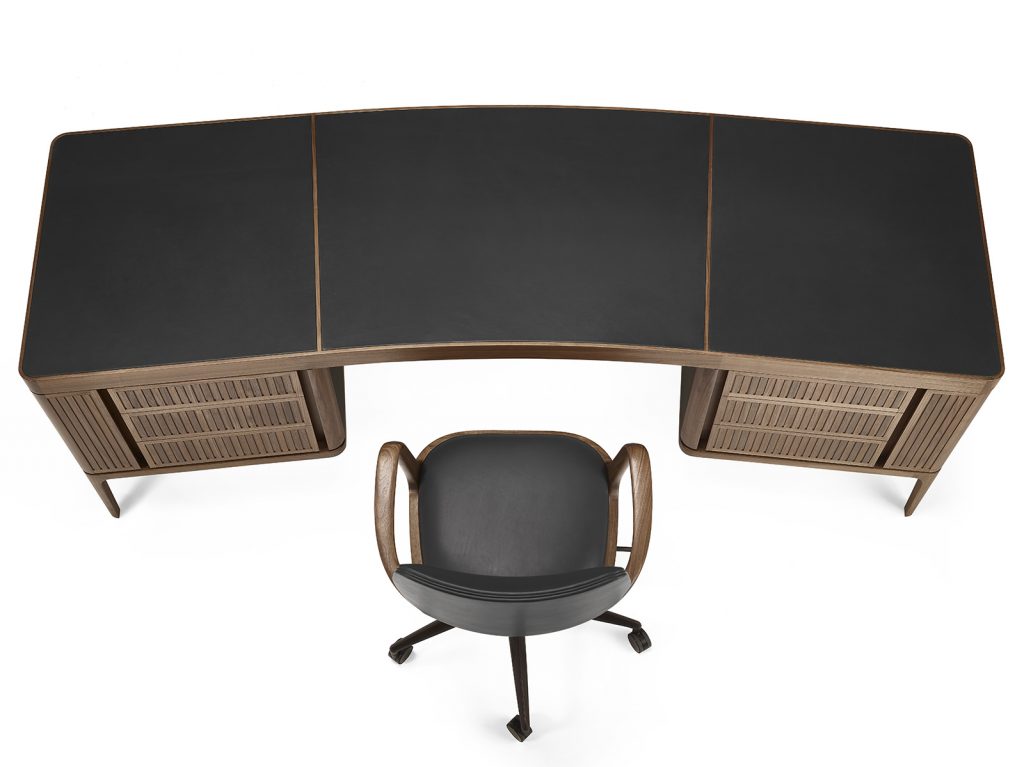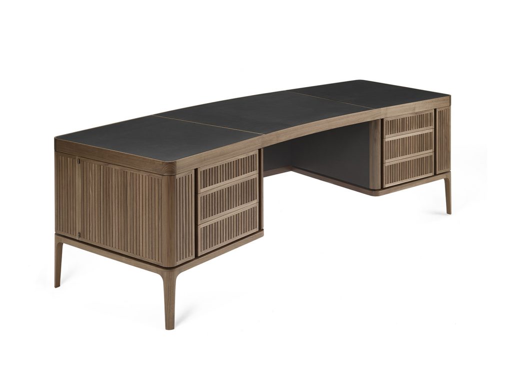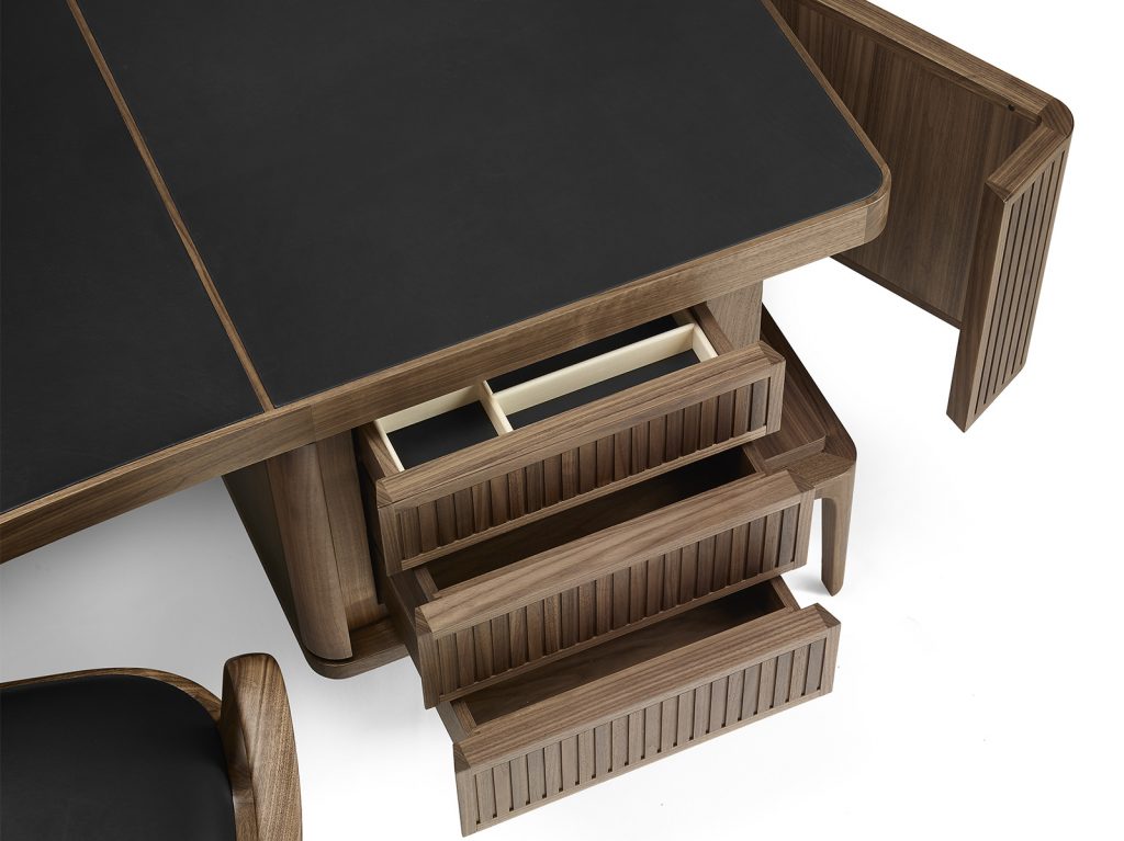 Desk made in solid american walnut and plywood veneered american walnut, six drawers and two side doors, top in wood or leather, on request internal covered in leather.