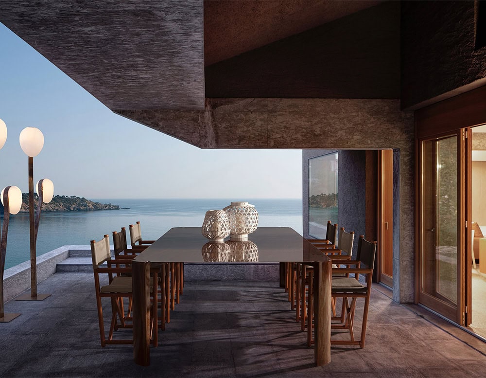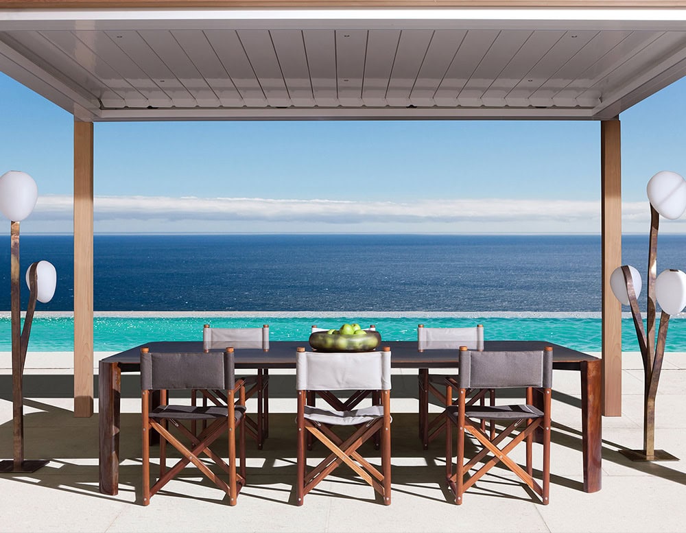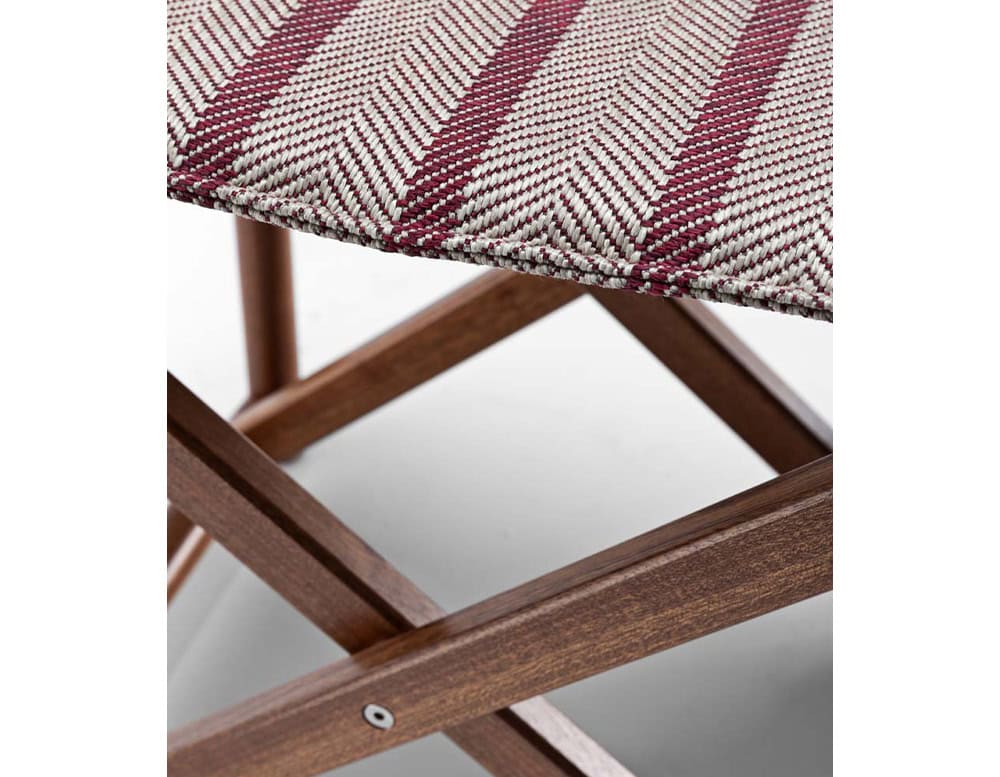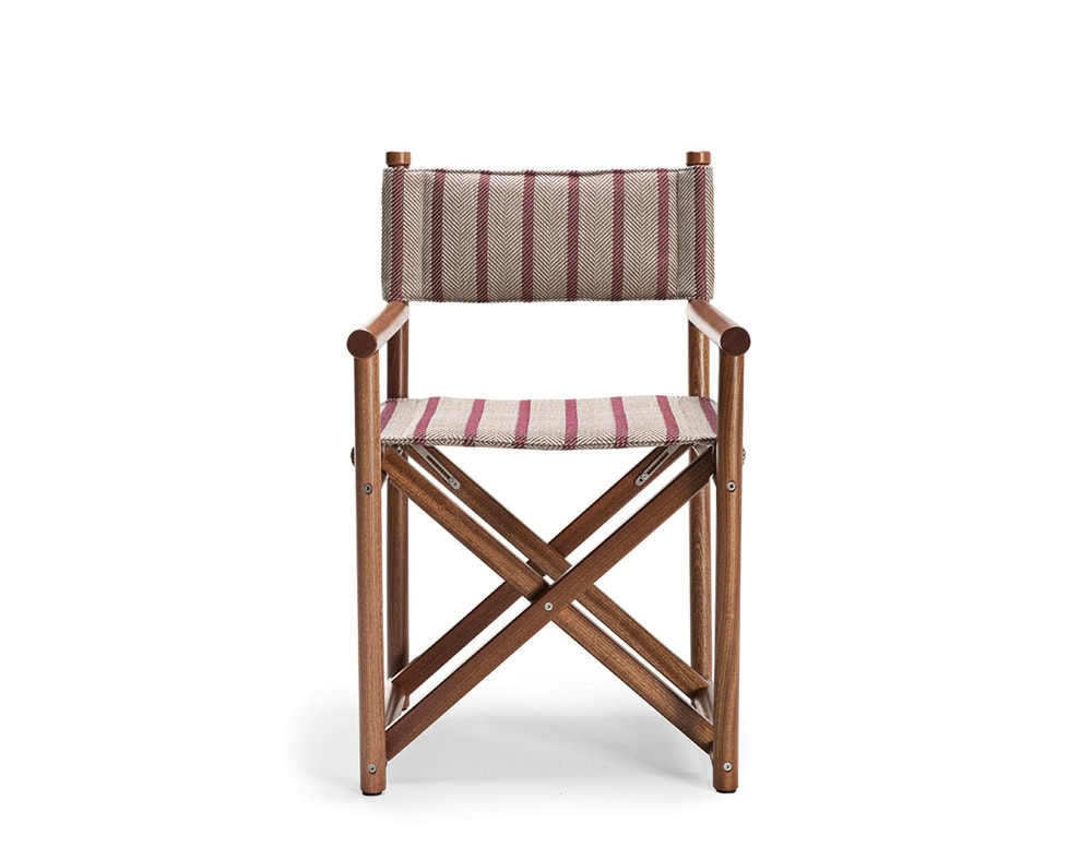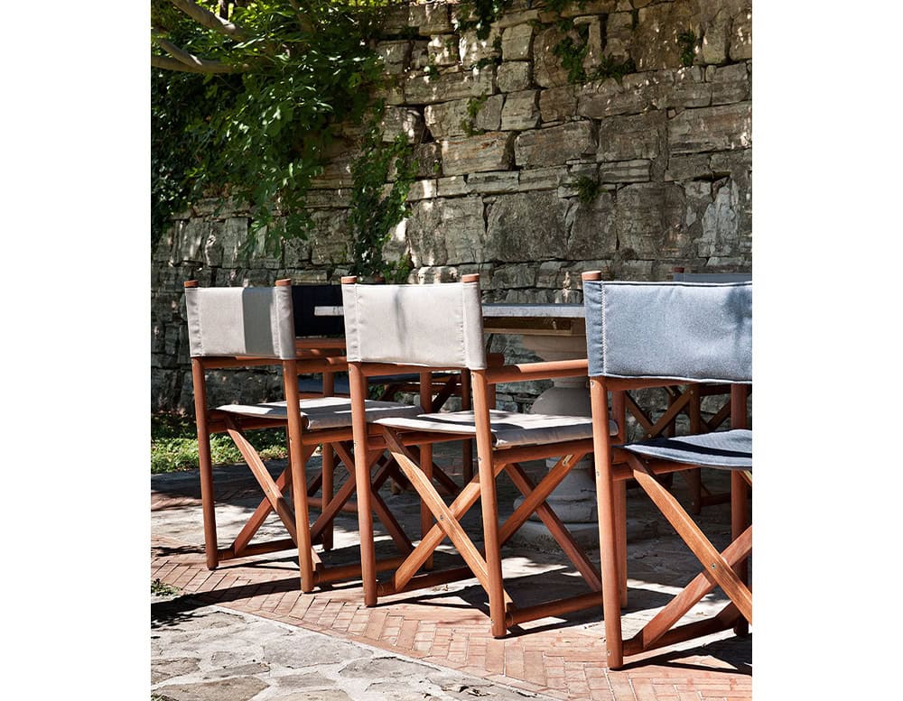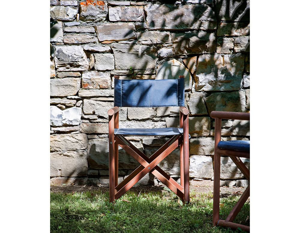 The director's chair is an interweaving of rigidity and softness. A fine product handcrafted from solid sapele mahogany, with stainless steel hardware and comfort ensured by a double-padded seat and back upholstered. Available in outdoor fabric and outdoor leather.