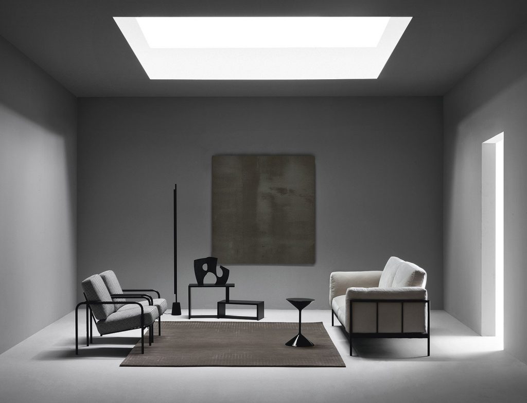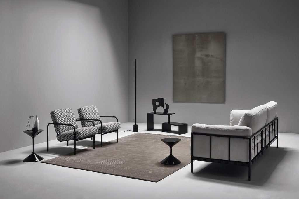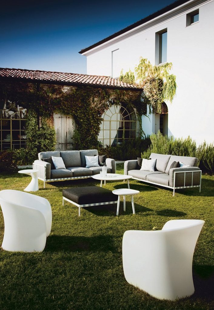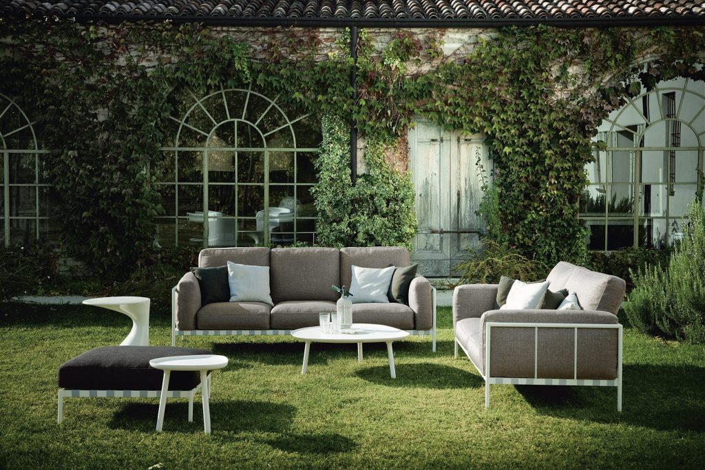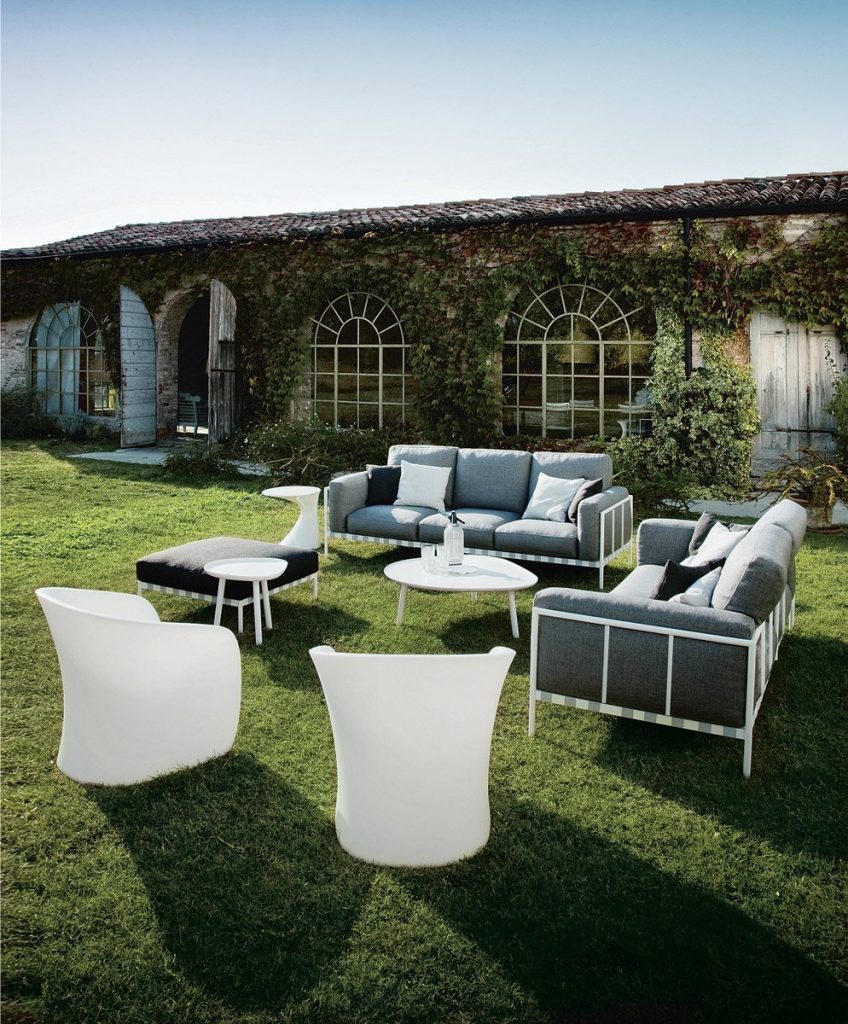 Supporting frame in painted steel for outdoor use in the shade of white or black. Elastic strips suspension. Seat, back and armrest cushion in open-cell reticulated polyether/Paineira, water-repellent vegetal fibre. Removable cover in fabric Talasso.