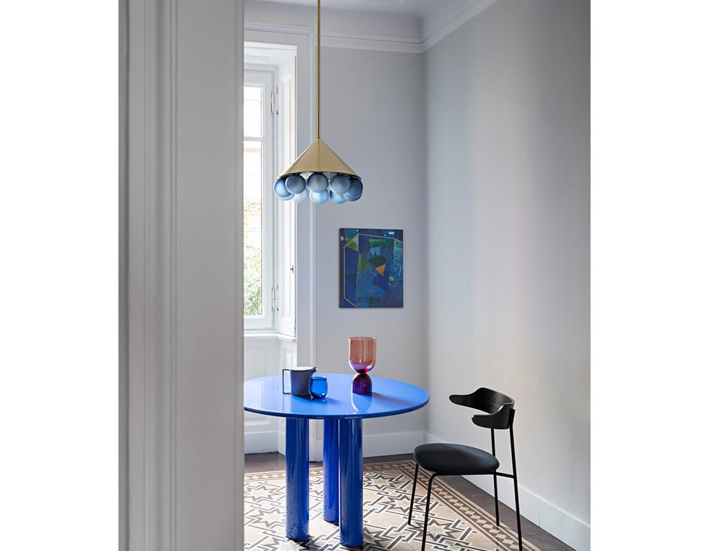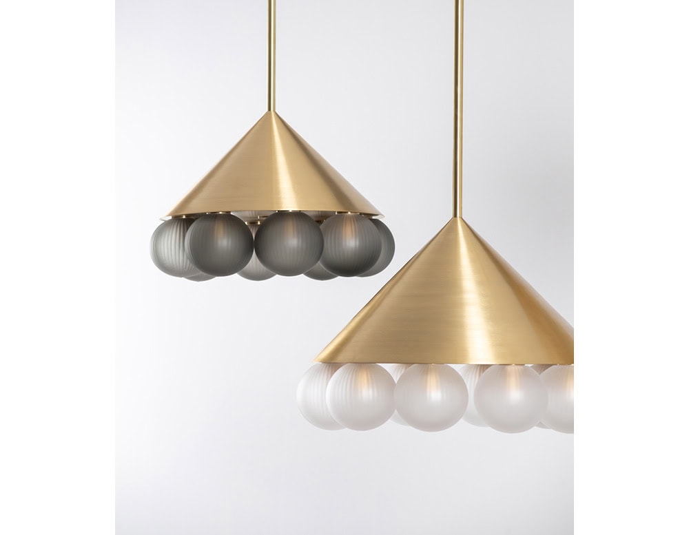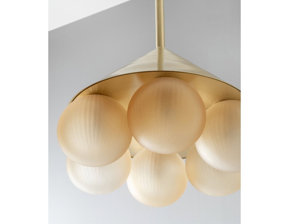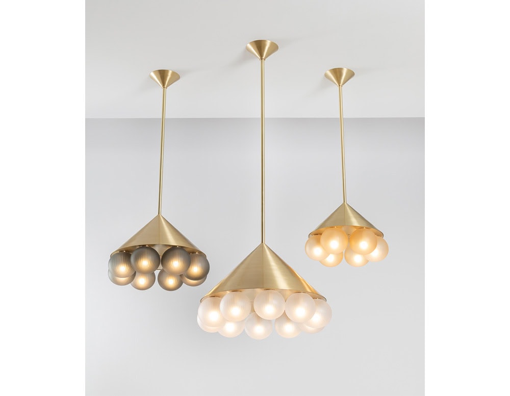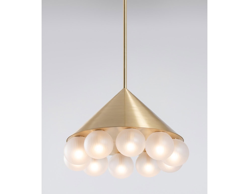 Rings of lit spheres of handblown glass nestled below a conical form and suspended by a single stem, the forms of the Peak Chandeliers are both playful and elegant. The ceiling canopy is an identical smaller conical shape, mirroring the form of the chandelier. Elevating simple geometric forms, the proportions are everything in the Peak Chandelier, and every detail has been carefully considered. The glass diffusers are available in both "dipped" glass, featuring the SkLO double-dipped flame-polished mouth and "textured" glass, featuring a soft, frosted finish and subtle sculpted vertical ridges.