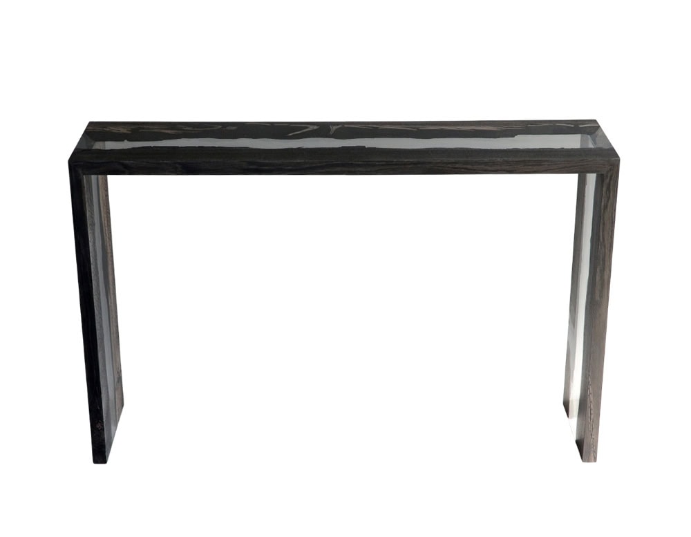 Peatland _ Console is made of a single OAK WOOD plank recovered in a small Alpine peat (dating back to the the fifth century before Christ), preserved in EXTRACLEAR RESIN resembling the peat water that has conserved them for millennia.
