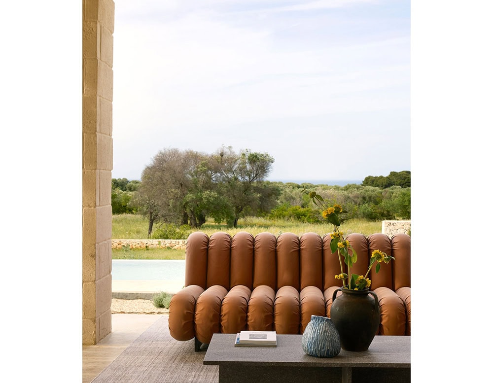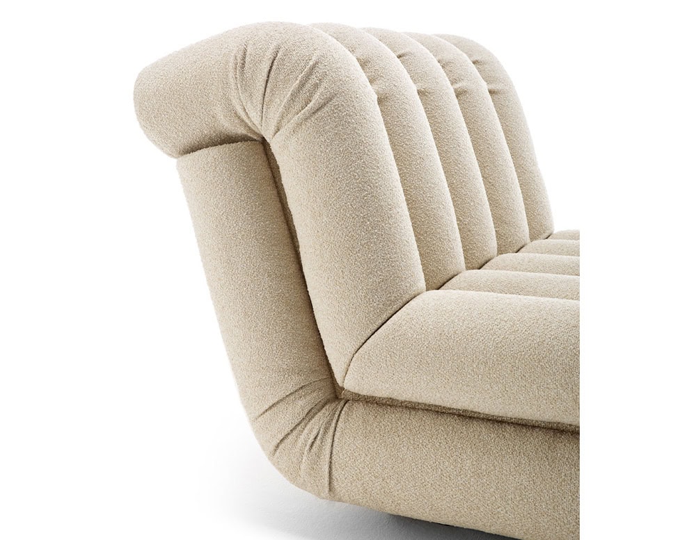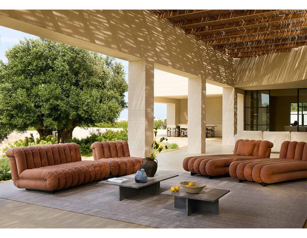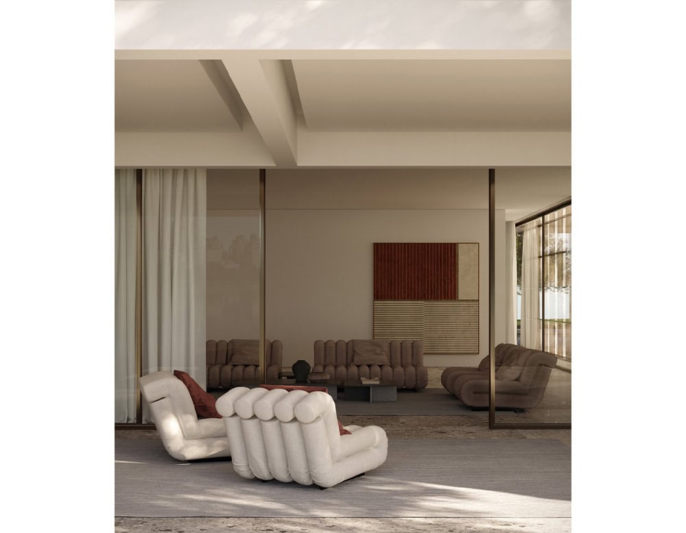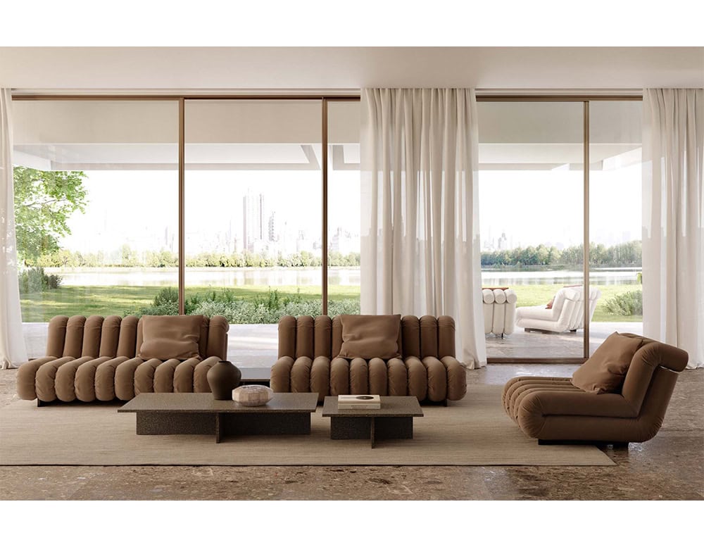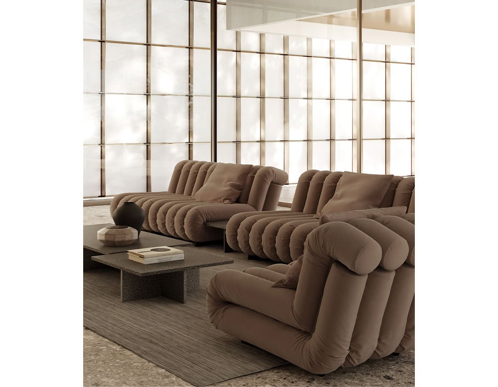 Its structure consists of five upholstered tubes arranged in a row, embodying themes of seriality and reproducibility. This iconic yet eclectic design can easily be paired with other furniture pieces.